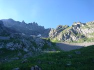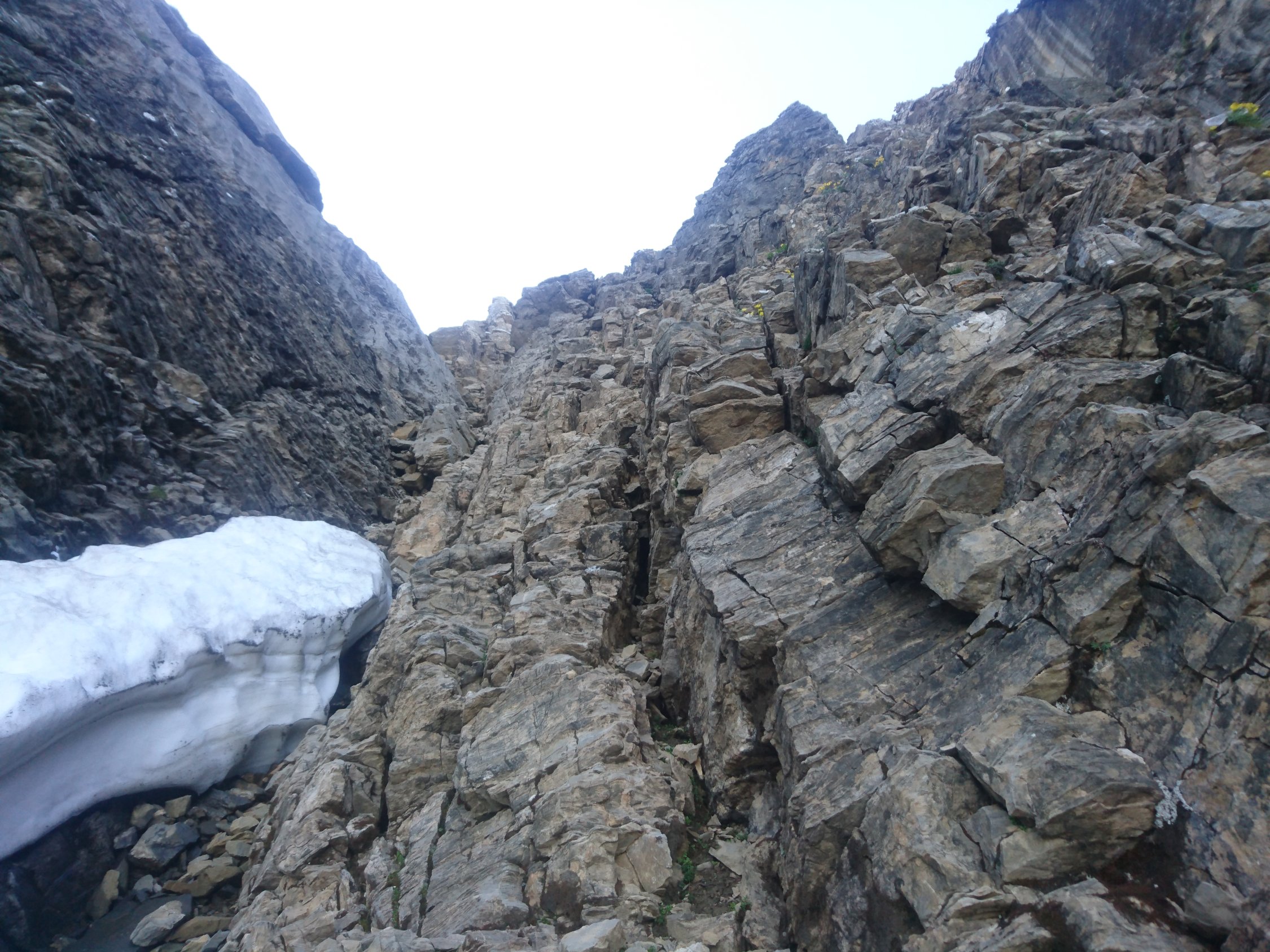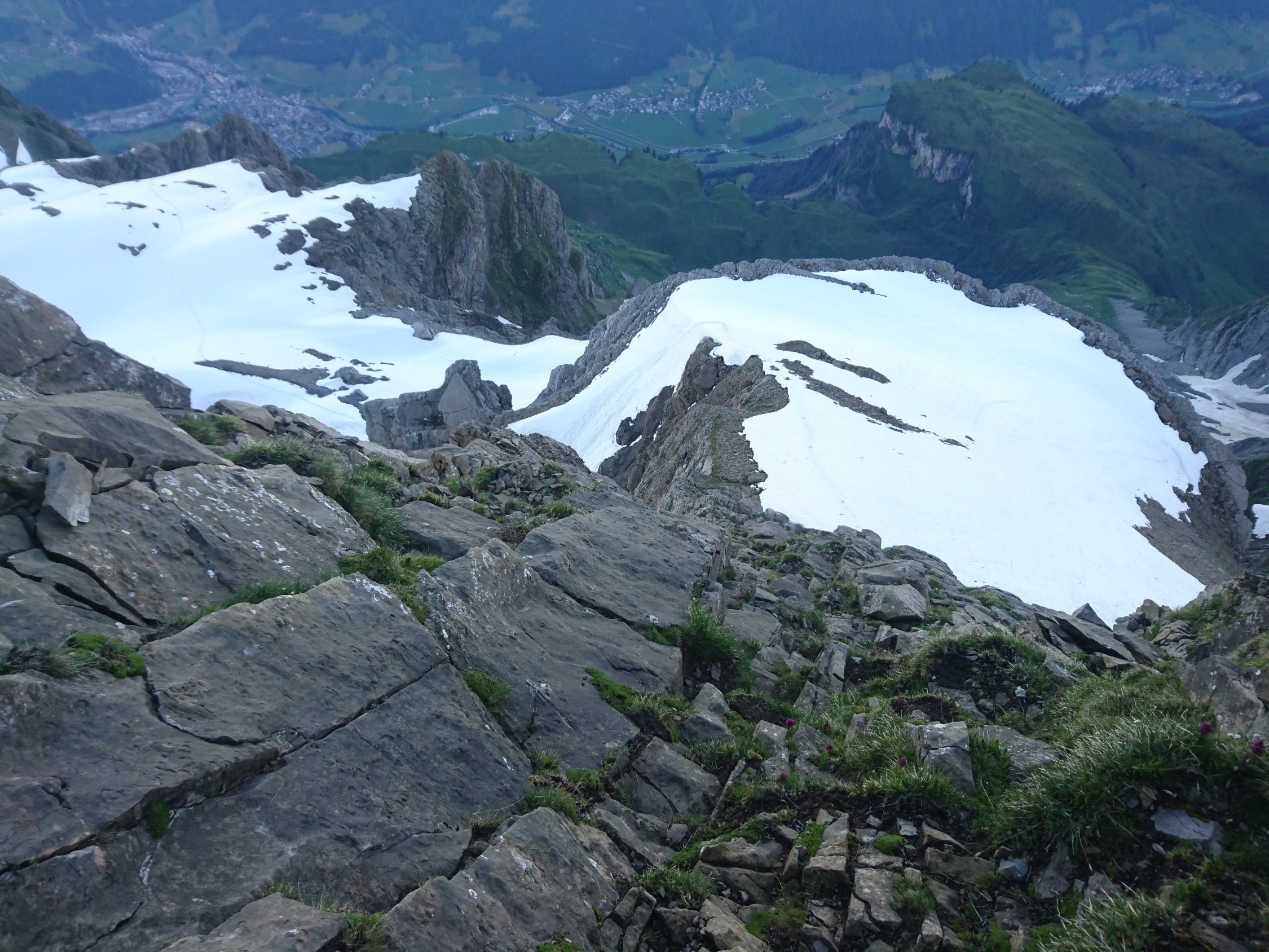 Der Schnee von letzter Woche ist komplett geschmolzen und der Fels trocken. Das Schneefeld zur Chanzle hat passable Trittspuren (Pickel und evtl. Steigeisen ganz nützlich ging aber auch ohne).