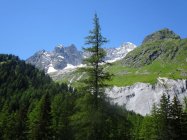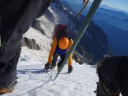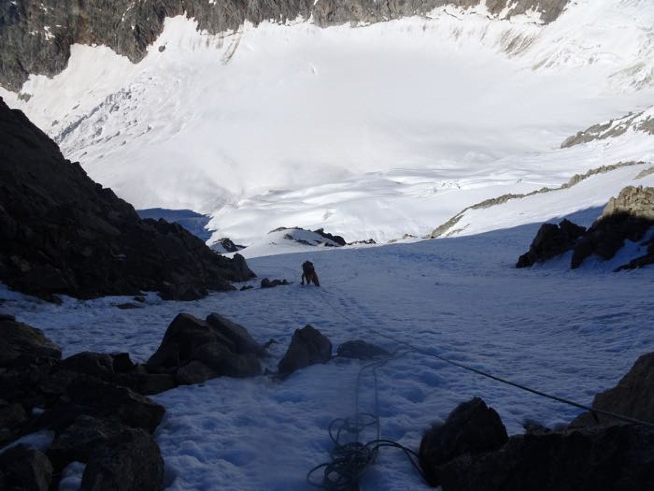 Es liegt noch genügend Schnee ab dem Biwak über die Felsplatten und auf dem Gletscher. Wir waren auf ca. 3100m vom Gletscher weg und über eine brüchige Flanke ca. 50m zum Grat hoch und folgten diesem.
