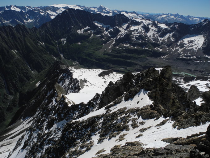 Der Abstieg nach Osten, dem Tälligrat entlang ist bis 2400m mit Schnee bedeckt.