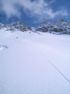 Gipfel nicht bestiegen wegen Wächten, Couloir verblasen, dann viel Pulver!