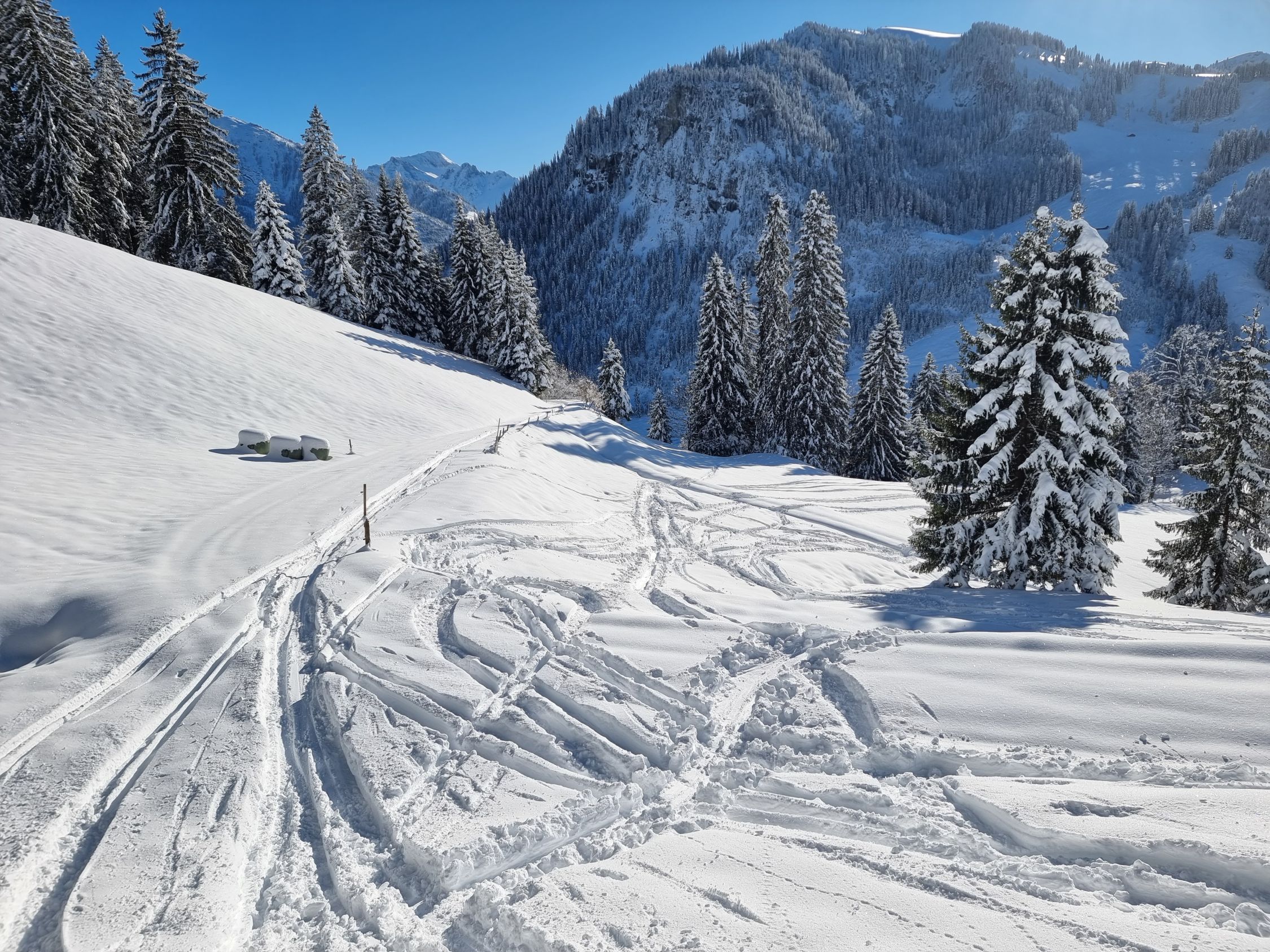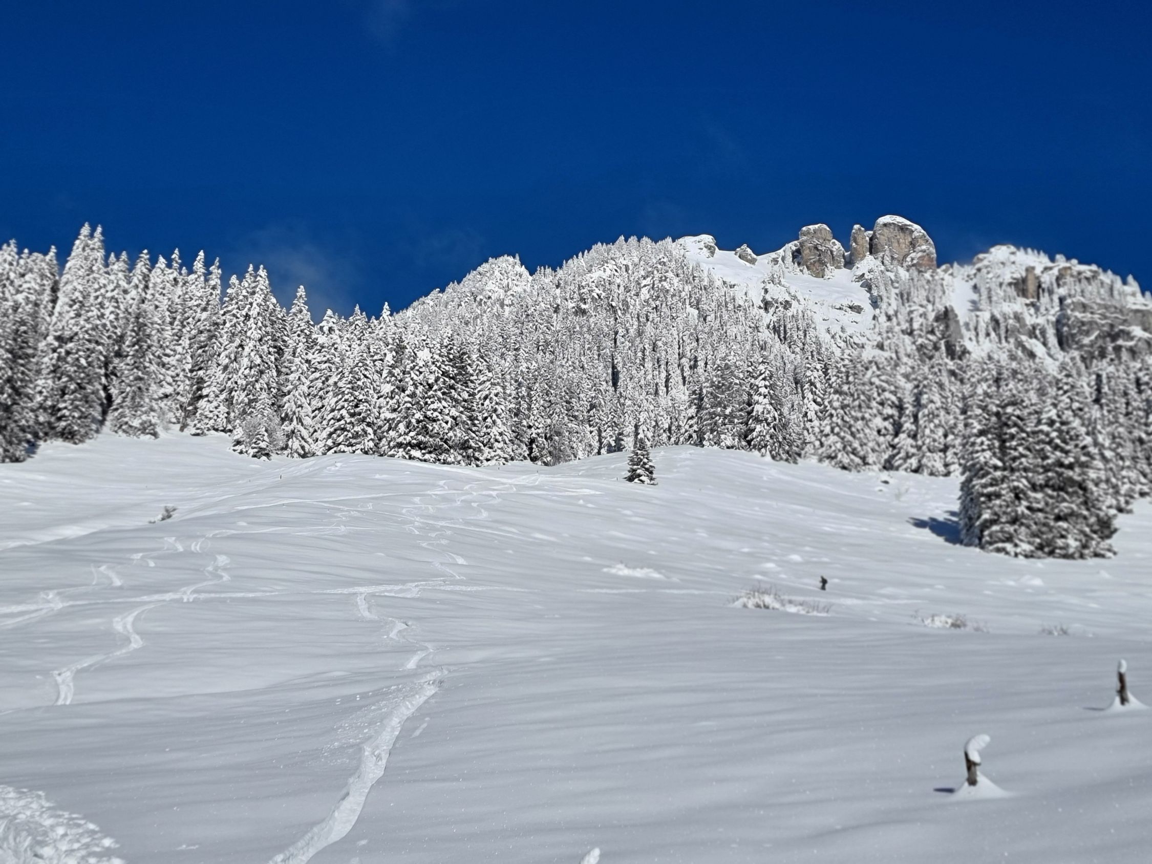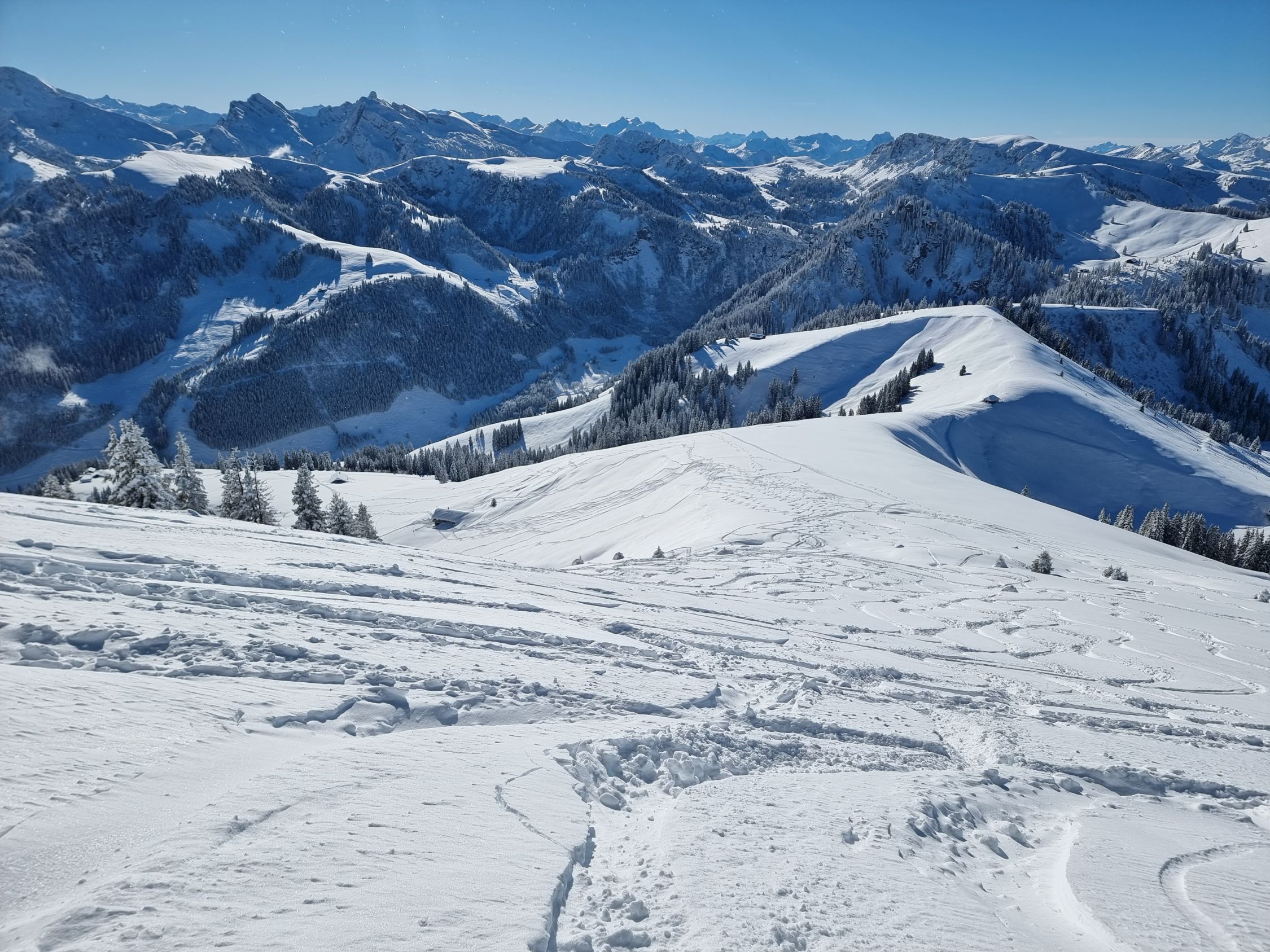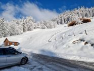 Nicht ab/bis Zwischenflüeh, sondern: Bei Zwischenflüeh hochfahren (Zahlstation, CHF 7.-) bis zum Parkplatz (links der Hauptstrasse, kurz vor dem Hüttli, vgl. Bild 1), ca. 1220 m. Los um 10.15 Uhr auf guter Spur durch die wunderbar verschneite Landschaft. Auf der weiten Gipfelfläche bis zum Wegweiser mit giftigem Wind. Knapp drei Std. inkl. Pausen. Abfahrt oben in Zauberpulver, 50 cm oder mehr. Gegen unten hin feucht werdend und schon mit kleinem Deckel. Immer wieder eine lohnende Tour ohne Lawinengefahr.