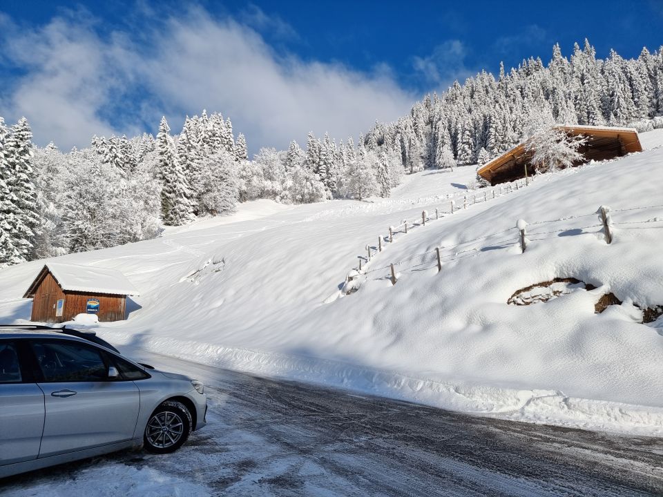 Nicht ab/bis Zwischenflüeh, sondern: Bei Zwischenflüeh hochfahren (Zahlstation, CHF 7.-) bis zum Parkplatz (links der Hauptstrasse, kurz vor dem Hüttli, vgl. Bild 1), ca. 1220 m. Los um 10.15 Uhr auf guter Spur durch die wunderbar verschneite Landschaft. Auf der weiten Gipfelfläche bis zum Wegweiser mit giftigem Wind. Knapp drei Std. inkl. Pausen. Abfahrt oben in Zauberpulver, 50 cm oder mehr. Gegen unten hin feucht werdend und schon mit kleinem Deckel. Immer wieder eine lohnende Tour ohne Lawinengefahr.