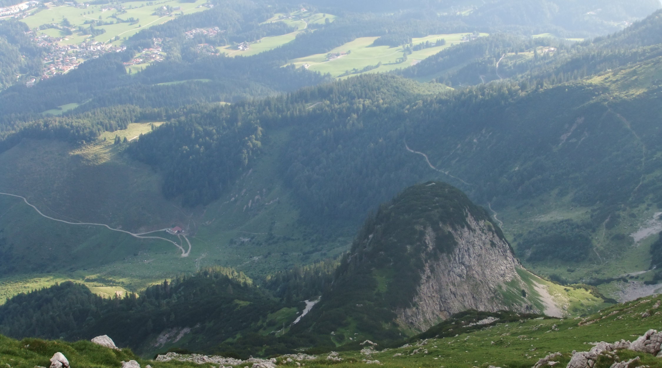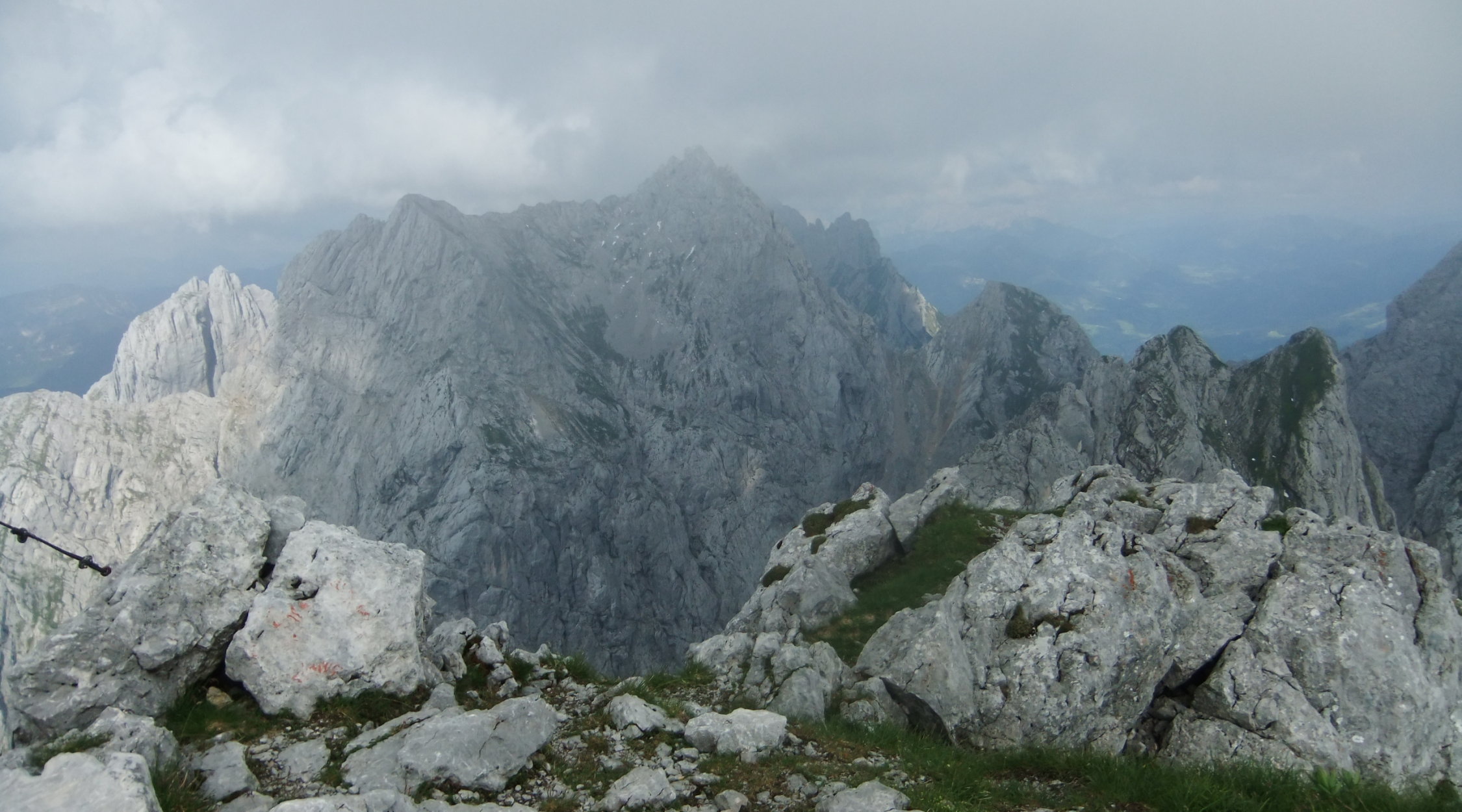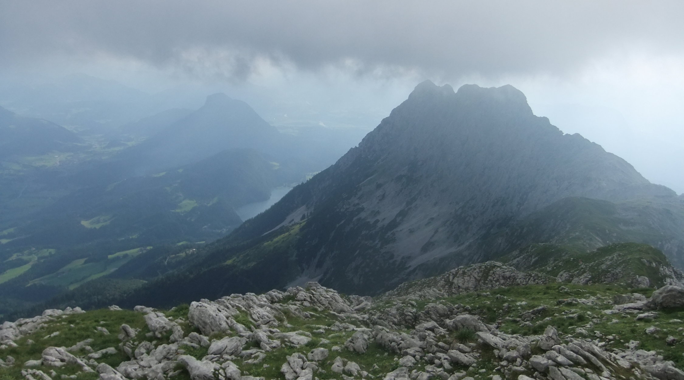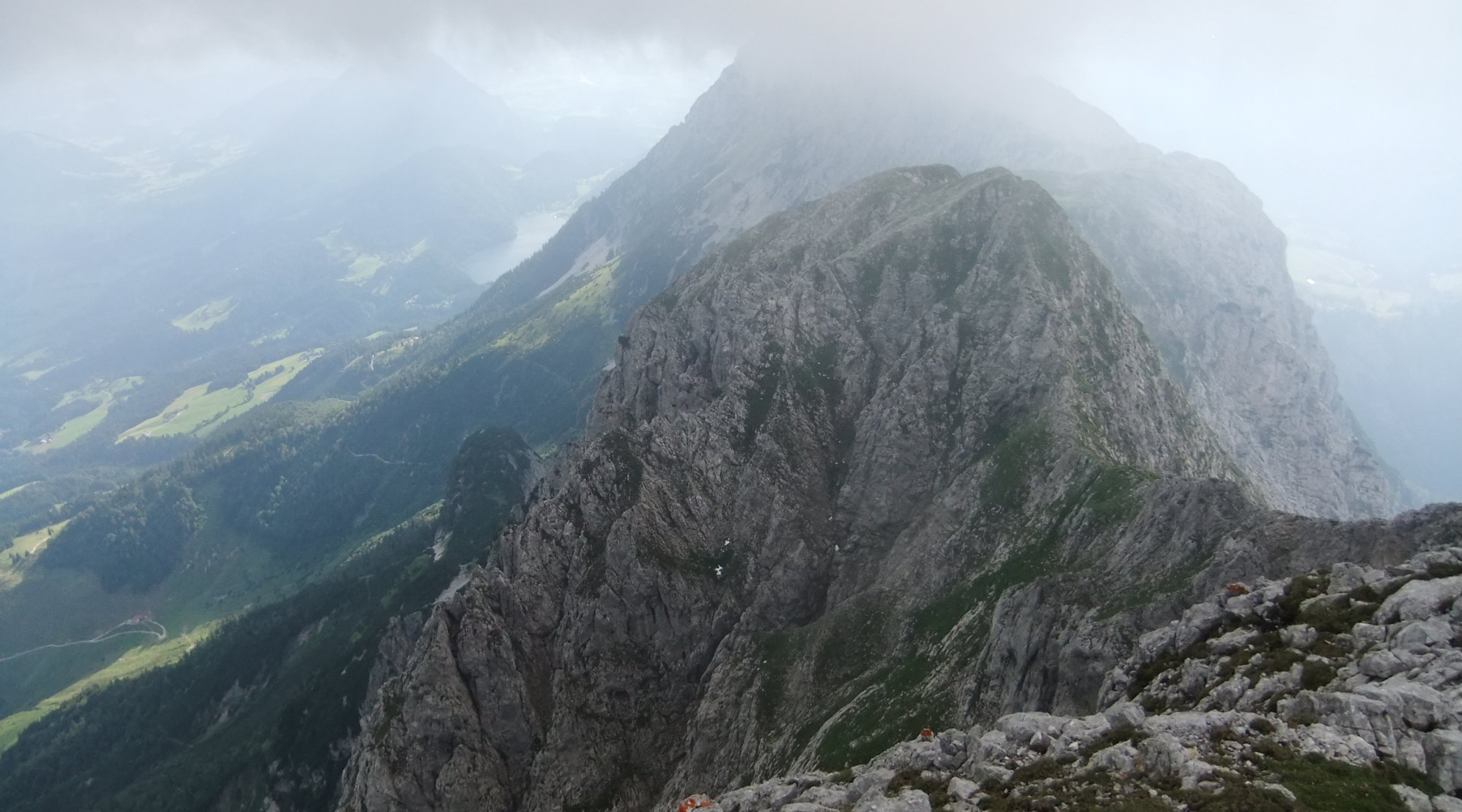 Tourenbeginn um 16:45 Uhr vom Unteren Gamskarköpfle nach dem Abstieg über Widauersteig und Aufstieg über den Kufstein Klettersteig. Sonnenschein mit Hochnebelphasen. Wetterprognose: