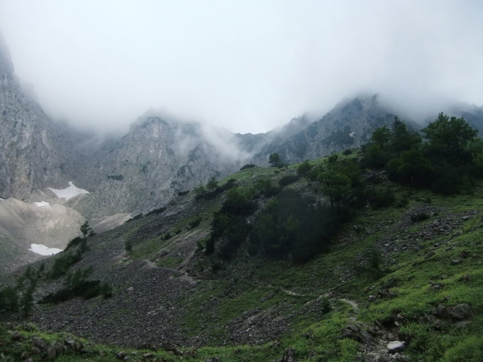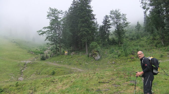 Regen. Anstatt geplant von der Gaudeamushütte im Wilden Kaiser zur Ackerlspitze aufzusteigen, disponierten wir nach frühem Hüttenfrühstuck um und fuhren zum Zahmen Kaiser. Tourenbeginn darum erst um 09:30 Uhr. Aufstieg und Bergerlebnis im Regen und Nebel. Erst im Abstieg wurde es besser.