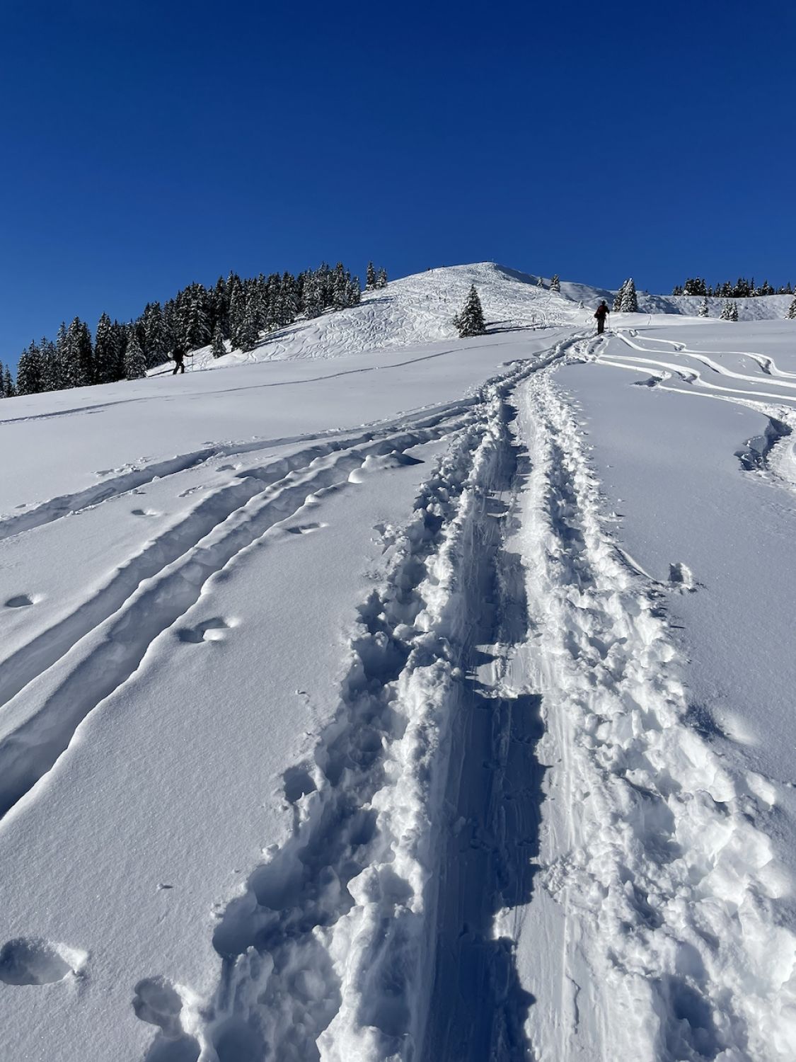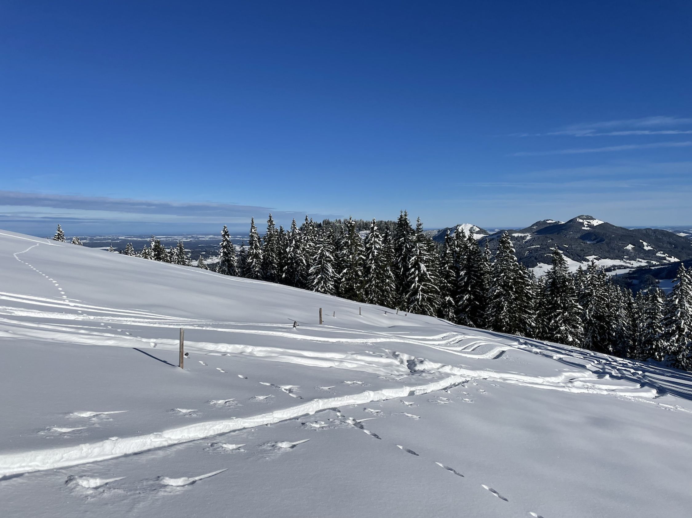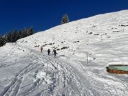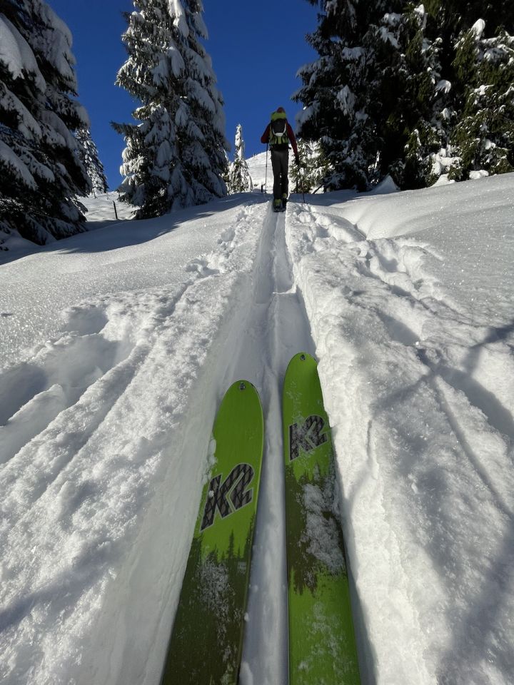 Ausreichend Schnee um ohne Shark-Bites hoch und wieder runter zu kommen. Auch im Wald ausreichend weiße Pracht. Im Aufstieg schöner Pow. Bei der Abfahrt waren wir gegen 12+ Uhr leider etwas zu spät dran, denn da war's schon schwerer Pow - das Einschwingen bei der allerersten Abfahrt der Saison dauerte damit länger :-). Trotzdem sehr schöner Saisonstart.
