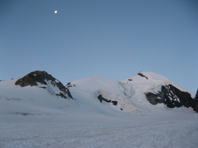 Frühstück Britanniahütte 4.00 Uhr. Wetter war besser als vorhergesagt. Abstieg Normalweg viel los, breite Spur, aber auch Spalten.