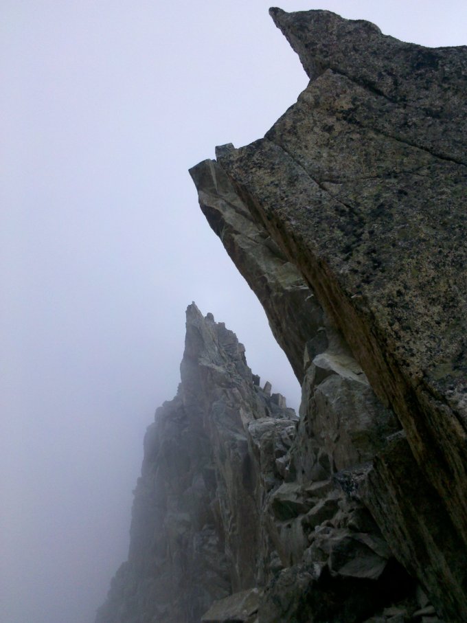S-Wand war das eigentliche Ziel, aber die Einstiegslängen (schwierigsten) waren nass. Ostgrat war komplett trocken und bietet herrliche Kletterei. Wir sind etwas spät, kurz nach den Bändern, auf den Grat gewechselt, dort lässt es sich besser klettern.