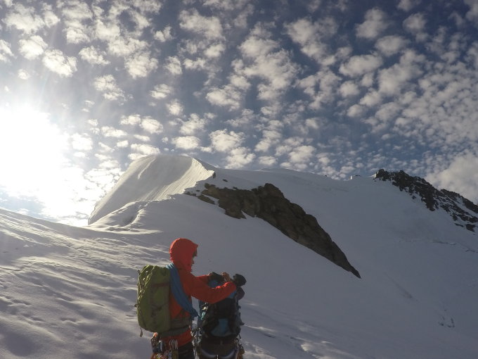 Wir haben für den Grat deutlich länger gebraucht als im SAC-Tourenführer beschrieben (Für uns war der Grat nur an wenigen kurzen Stellen am kurzen Seil machbar. Grösstenteils haben wir uns an Blöcken provisorisch gesichert). Dadurch die letzte Talfahrt verpasst. Da die Weissmieshütte nicht wirklich Gastfreundlich ist haben wir dann noch den Abstieg nach Saas Grund vorgenommen.