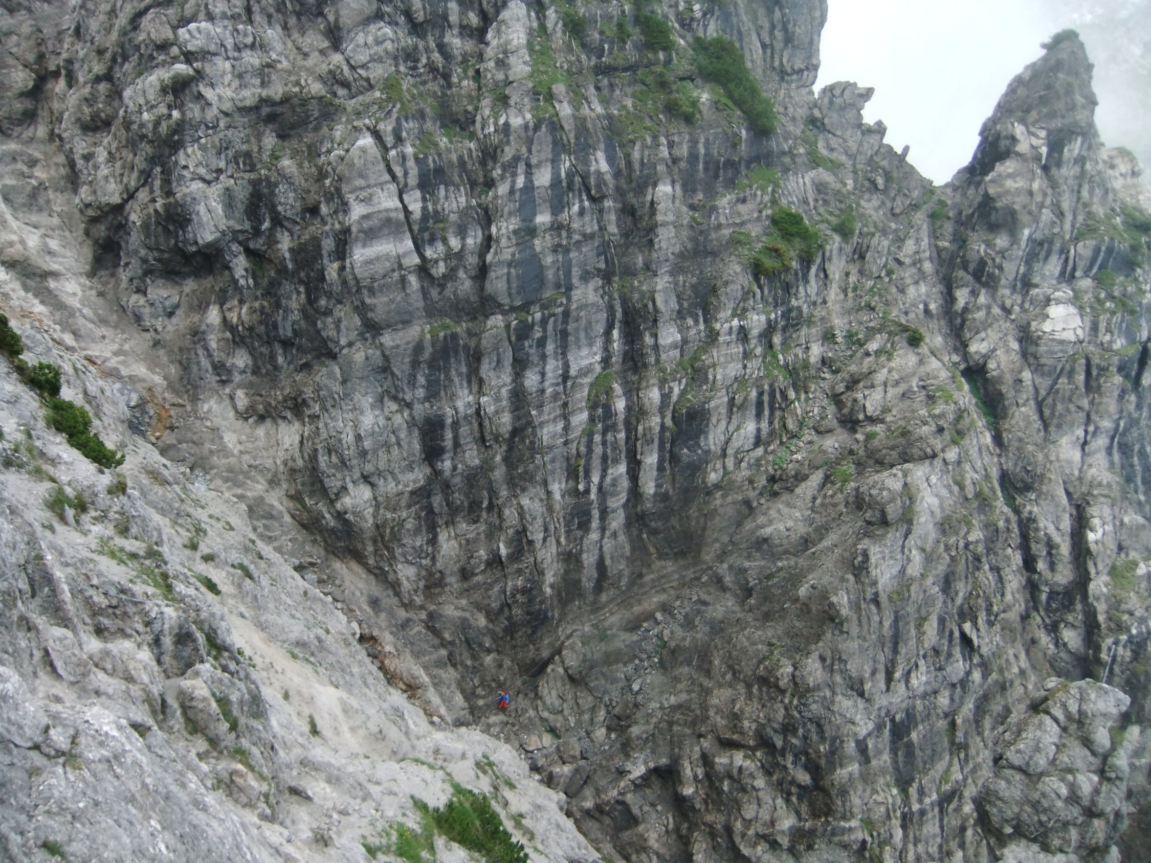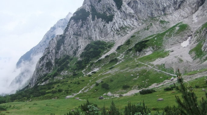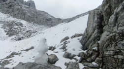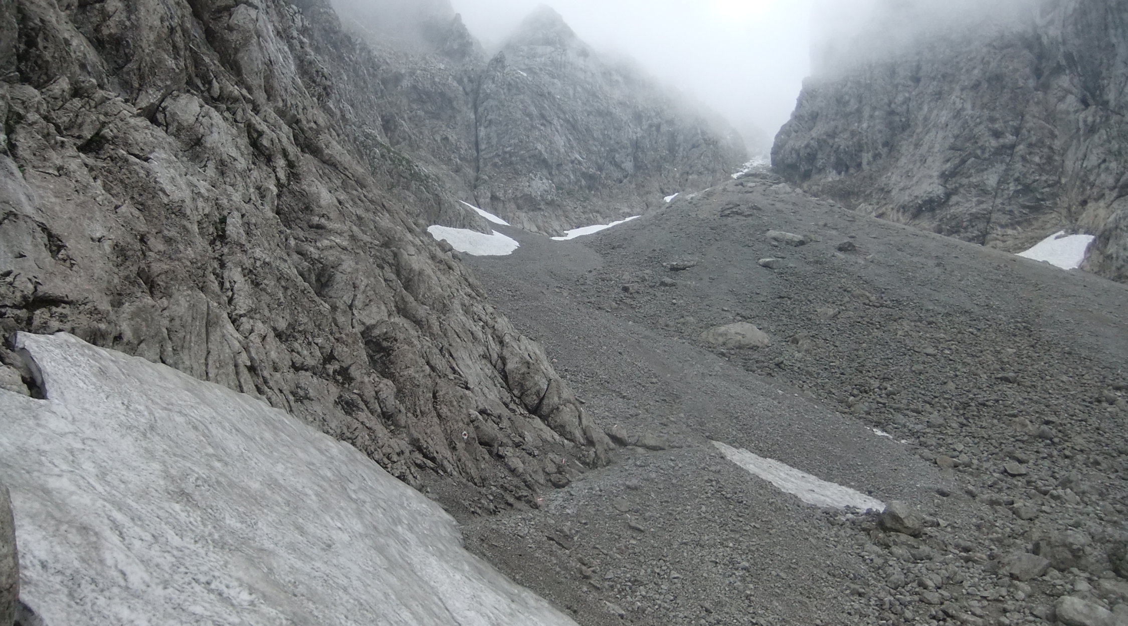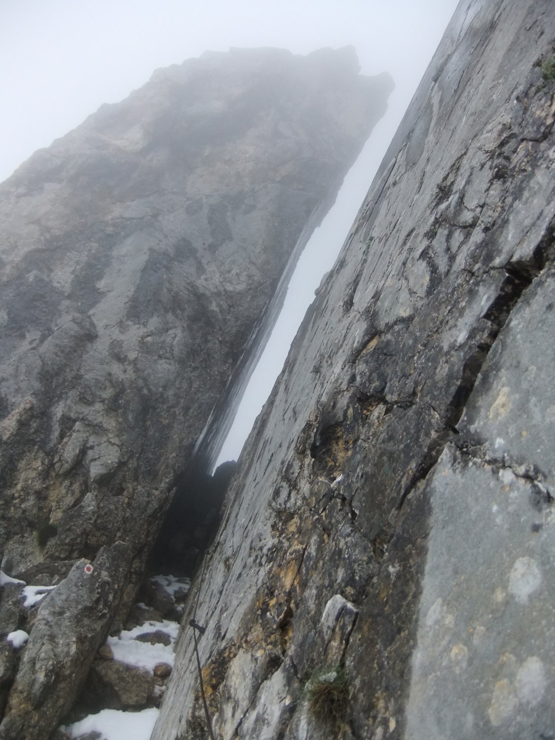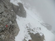 Meine Planung sah vor, vom Kopftörl nordseitig zum Gamsängersteig (KS 2) auf alpinem Seig rüber zu queren und auf diesem zur Ellmauer Halt (2344 m) zu kommen. Von dieser dann über den Kaiserschützensteig (KS 3) abzuklettern zur Babenstuberhütte und von dort durch den Scharlingerboden hinunter zum Hans-Berger-Haus (936 m). Dann retour über das Stripsenjoch zur Griesner Alm. Bei vorgefundenen Verhältnissen disponierte ich am Kopftörl um. Ich sah zu, daß ich die Nebel- und Schneezone wieder verließ. Ich entschied mich dann für die andere Rückkehr-Variante über die Gruttenhütte zum Jubiläumssteig und weiter hinauf zum Ellmauer Tor, dann durch Steinerne Rinne nordwärts hinab zum Egger-Steig und auf diesem retour zum Stripsenjoch. Den Abstecher zur Hinteren Goinger Halt schenkte ich mir bei dem Nebel und Schnee dort oben. Ich hätte zudem noch spuren müssen.