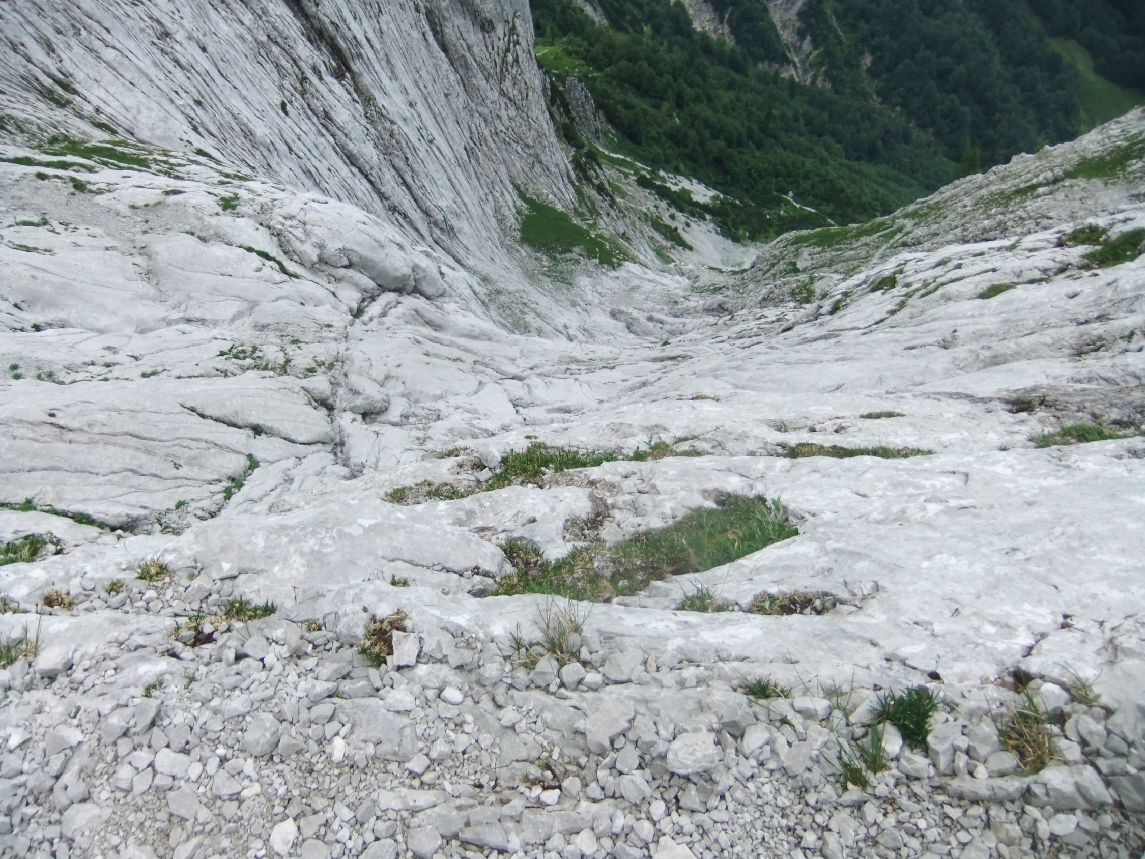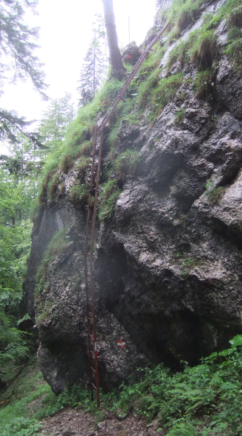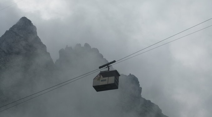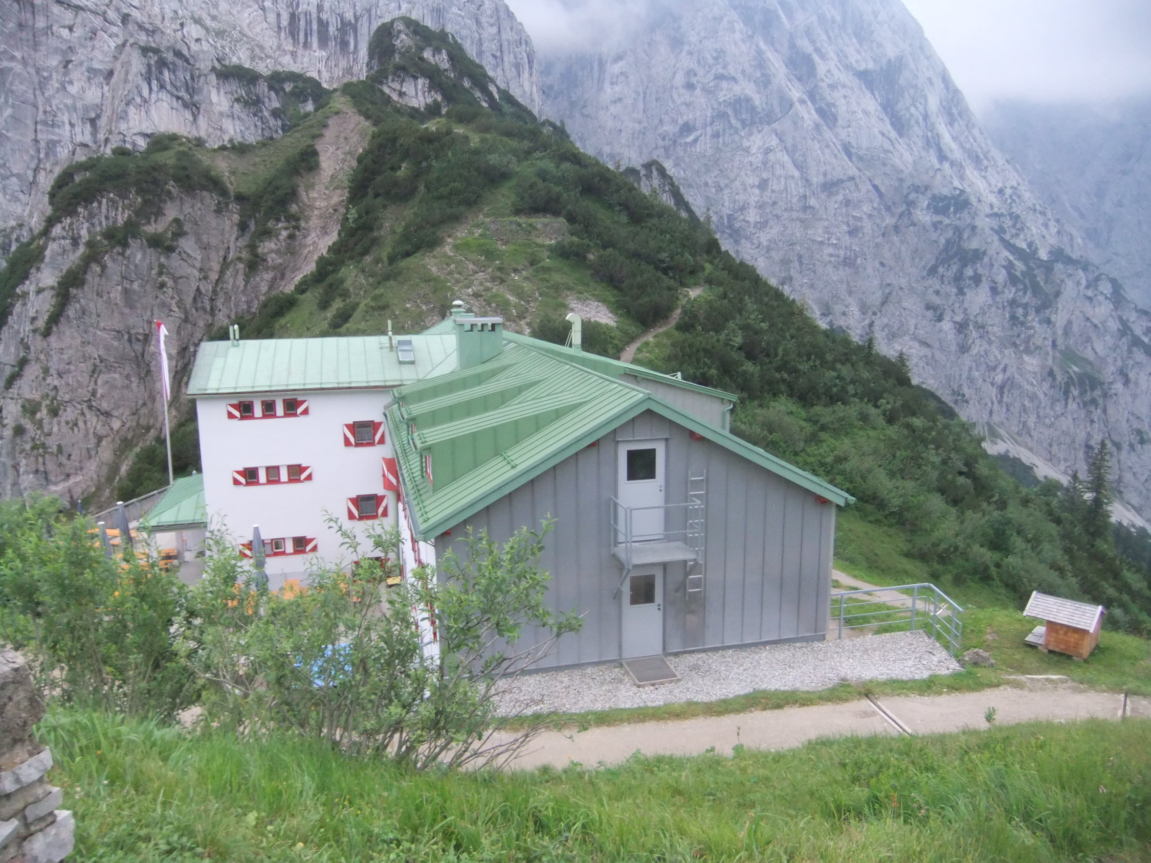 Meine Planung sah vor, vom Kopftörl nordseitig zum Gamsängersteig (KS 2) auf alpinem Seig rüber zu queren und auf diesem zur Ellmauer Halt (2344 m) zu kommen. Von dieser dann über den Kaiserschützensteig (KS 3) abzuklettern zur Babenstuberhütte und von dort durch den Scharlingerboden hinunter zum Hans-Berger-Haus (936 m). Dann retour über das Stripsenjoch zur Griesner Alm. Bei vorgefundenen Verhältnissen disponierte ich am Kopftörl um. Ich sah zu, daß ich die Nebel- und Schneezone wieder verließ. Ich entschied mich dann für die andere Rückkehr-Variante über die Gruttenhütte zum Jubiläumssteig und weiter hinauf zum Ellmauer Tor, dann durch Steinerne Rinne nordwärts hinab zum Egger-Steig und auf diesem retour zum Stripsenjoch. Den Abstecher zur Hinteren Goinger Halt schenkte ich mir bei dem Nebel und Schnee dort oben. Ich hätte zudem noch spuren müssen.