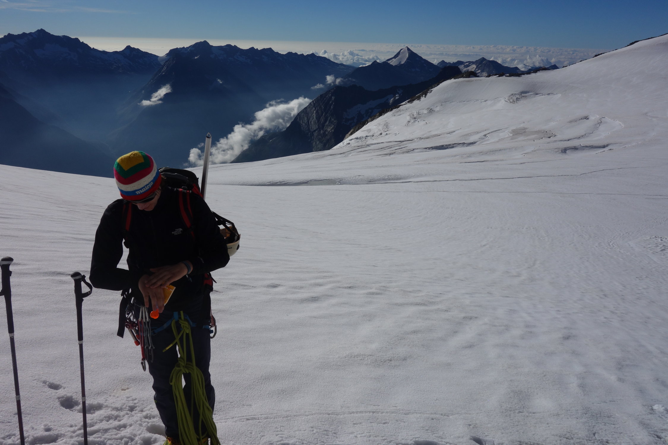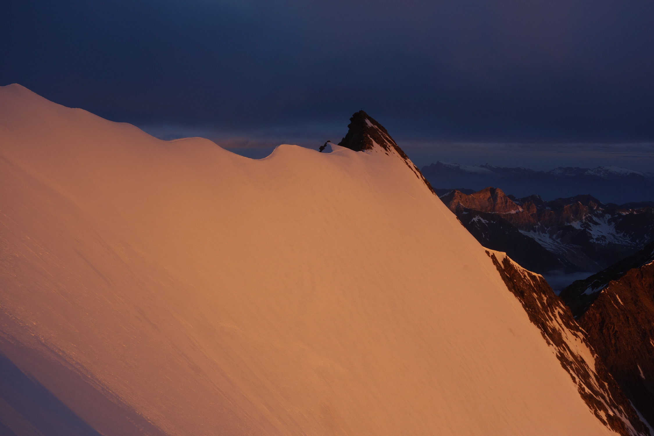 Gletscher noch gut eingeschneit, im Bereich der Aufstiegsspur sind keine Spalten erkennbar. Ab dem Windjoch herrschte ein starker Wind. Gute Aufstiegsspur, die problemlos zu begehen ist. Im Bereich des Grates, wo der NO-Grat auf den Grat zum Stecknadelhorn trifft, war eine unangenehme Schnneewechte. Da wir an diesem Tag die ersten am Grat waren, mussten wir uns da durchwühlen. Um 06:30 Uhr waren wir bei -2 Grad am Gipfel. Abstieg problemlos. Schnee auf dem Gletscher auf Grund der frühen Uhrzeit im Auf- wie im Abstieg noch gefroren. Nach einer kurzen Pause in der Mischabelhütte direkt weiter ins Tal. Unten wollten wir ein paar Tiefennmeter sparen und nutzten die Bahn ab Hannig. ...der Preis von 50 SFR für meinen Sohn und mich für die paar Höhenmeter Abfahrt hat mich dann aber doch etwas schockiert. Insgesamt aber ne schöne Tour bei nahezu idealen Verhältnissen.