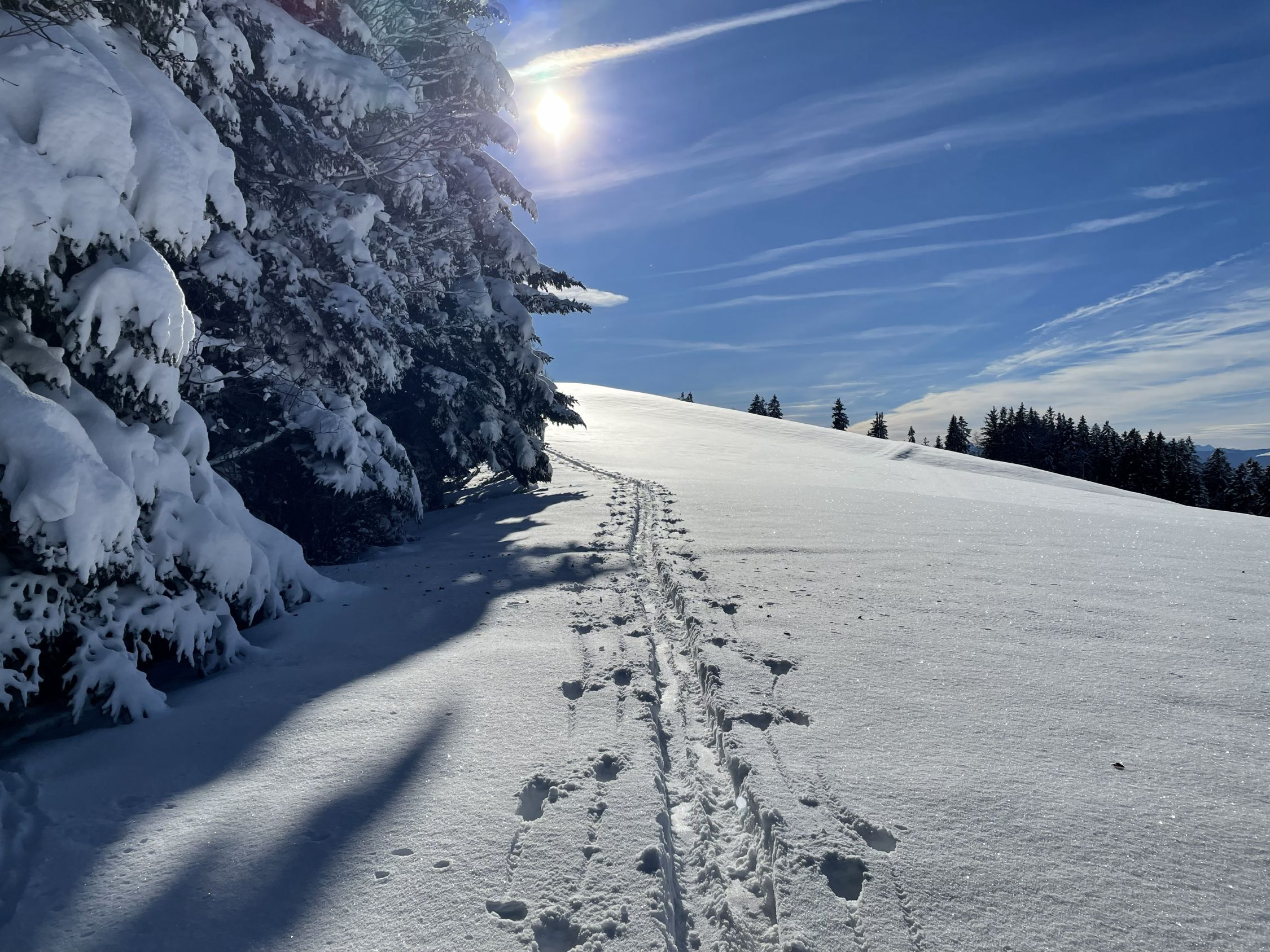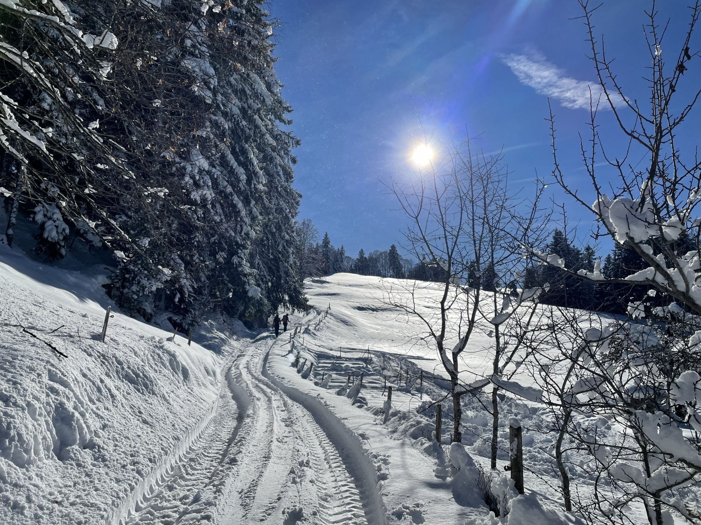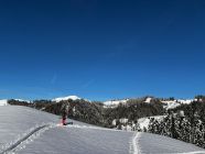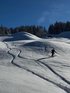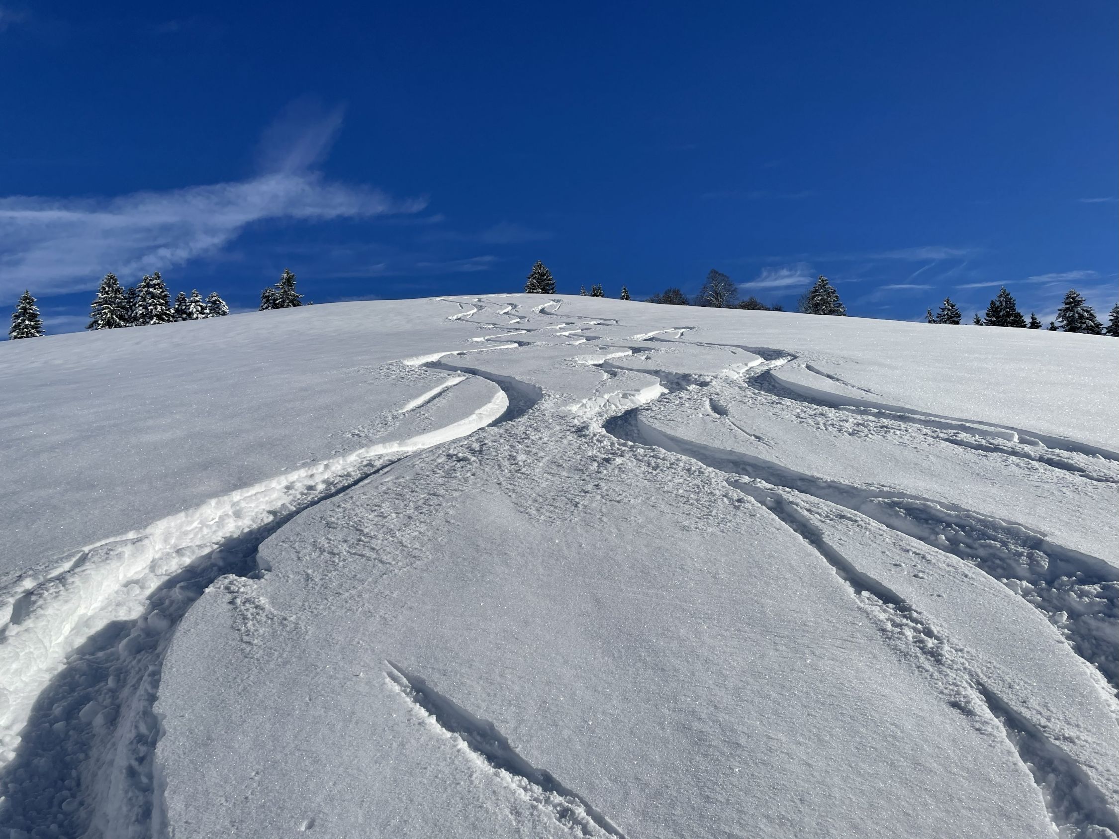 Schnee: beste Bedingungen 30-40cm Pulver auf teilweise guter Unterlage, kein Boden- bzw. Steinkontakt, einzig bei der kurzen Walddurchquerung oberhalb Erlenmoos(Ski tragen), beim Aufstieg über die Strässchen teilweise Ski tragen(Schwarzräumung = für die Einheimischen sicher sehr gut, für Türeler leider weniger)