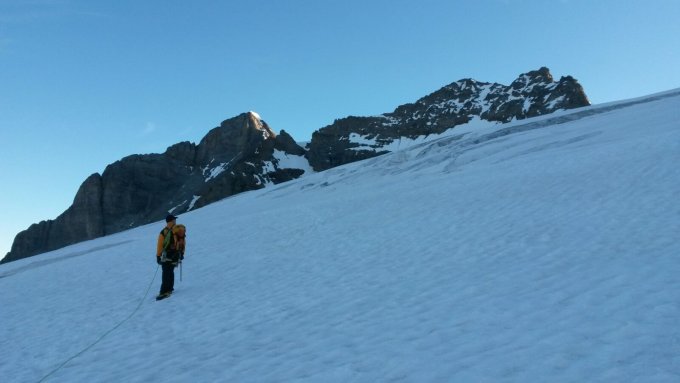 Perfekte Verhältnisse, lediglich morgens (4.20 h) im Zustieg durchs Beesibergli zu warm (vllt. hätten wir aber auch einfach im T-Shirt losgehen sollen...). Ab ca. 2800 m Übergang in tragenden Altschnee; Oberer Grindelwaldgletscher mit wenigen, gut zu umgehenden Blankeisstellen. Im Bereich 2950 - 3150 zwei grössere Querspalten, zumindest die untere kann bei weiterer Ausaperung mit der dünner werdenden Schneebrücke zu fortgeschrittener Tageszeit Probleme bereiten.