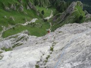 Westtangente Geneigte Wandkletterei in überwiegend festem Fels. Schlüsselstelle ist die vierte SL, eine steile abdrängende Rissverschneidung die wohl überlegte Züge erfordert. Belohnt wird man mit einem ausgesetzten Hängestand.