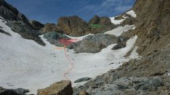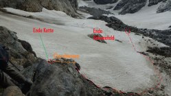 Übergang vom Felsband 2600m. ü.M. auf den untern Teil des Chaltwassergletschers anspruchsvoll.