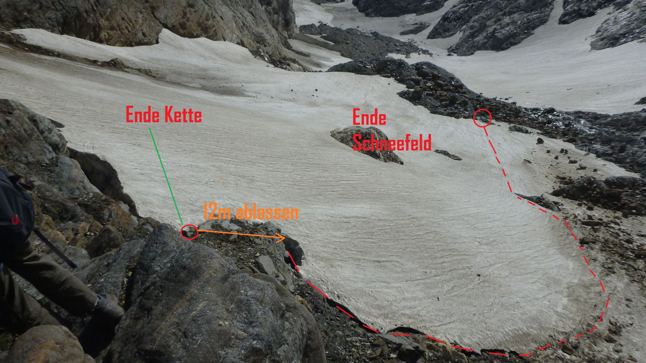 Problemstelle Ende der Kette: Da das Schneefeld für Trekkingschuhe zu steil war (ein Ausrutscher hätte wohl erst auf dem Mittelband nach 80 m geendet) liess ich die Familie 10m runter in den kleinen Bergschrund. Diesem konnten wir oberhalb nach rechts folgen bis zu einer leicht flacheren Rinne die mit Steinen versetzt war und den Füssen etwas Halt bot.