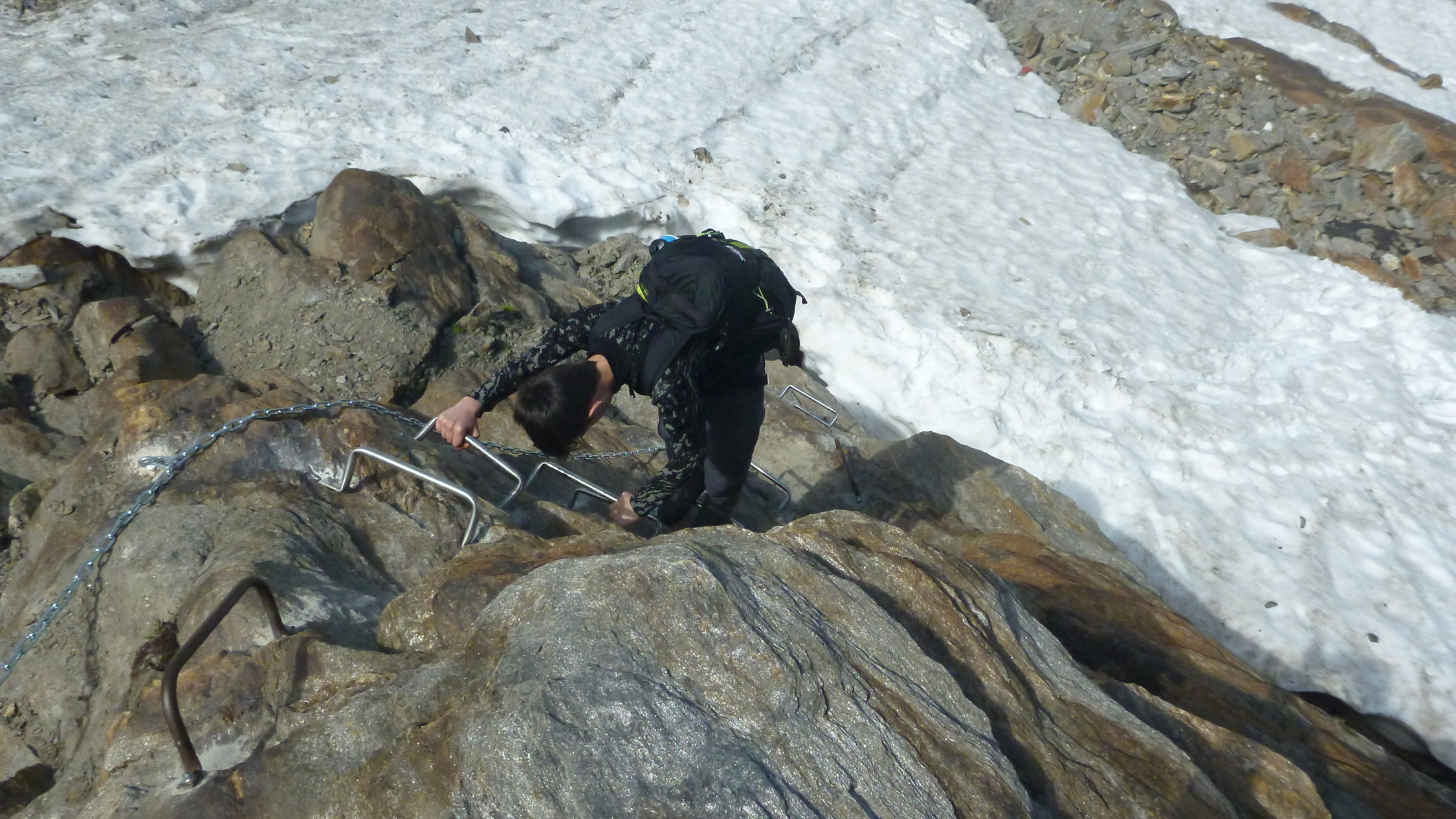 Material Chaltwasserpass: Klettergurt, Seil 30m, Pickel, Steigeisen (Kinder brauchen sie nicht unbedingt, wenn die Eltern sie tragen). Der mit Ketten versetzte Teil empfanden wird als problemlos, es hat sogar Spass gemacht in den ausgesetzten Felsen zu gehen.