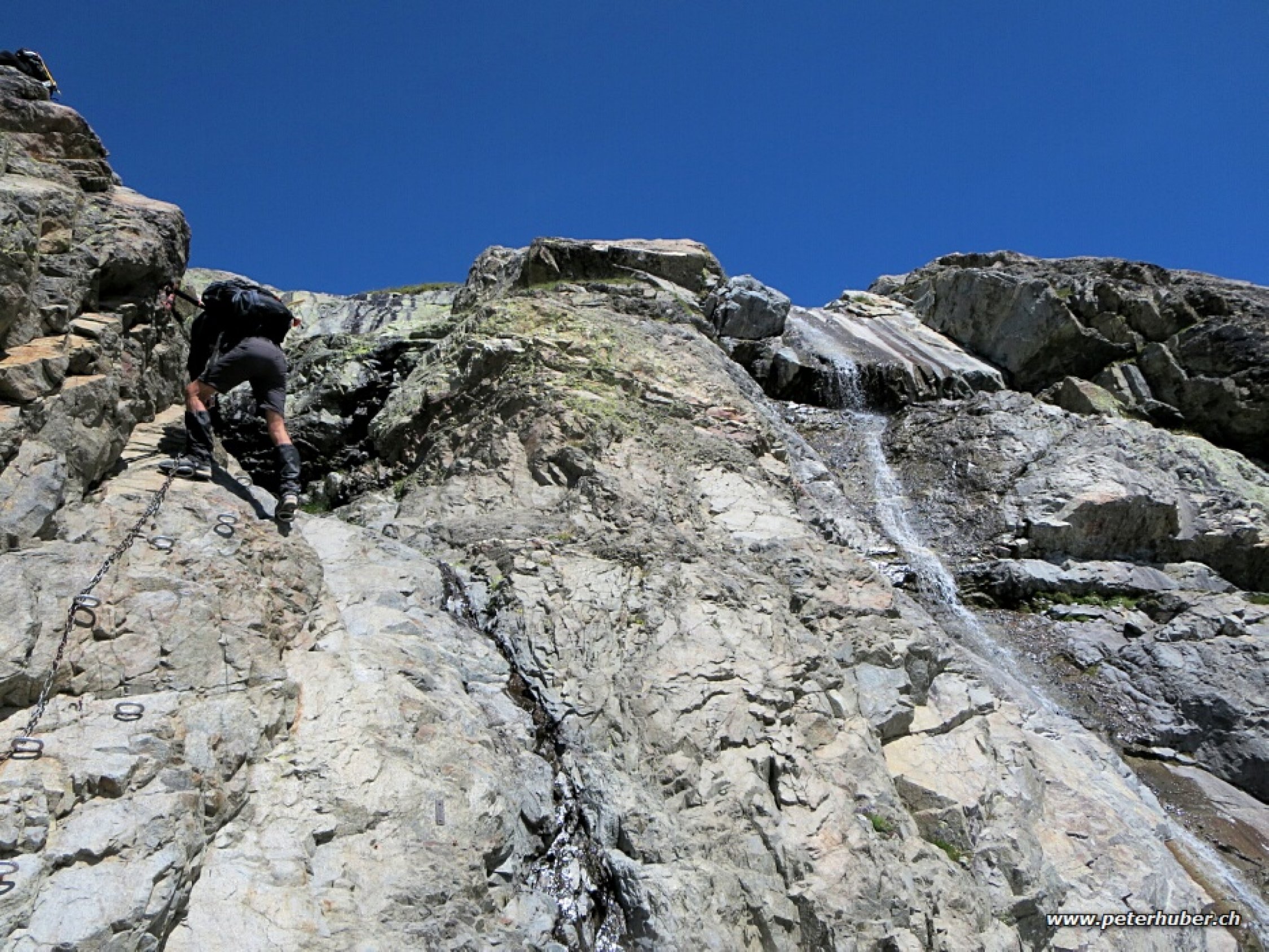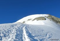 Herrlicher Tag, schön und warm. Daher früher Start angesagt damit der Schnee noch trägt. Aufstieg in die Fuorcla da Boval gut machbar. Unten entlang des Wegs, dann etwas unübersichtlich (etliche Wegspuren und irreführende Steinmännchen). Fast kein Schnee mehr. Dann sehr gut markiert mit roten Punkten über die Felsen hinauf. Fels war trocken und warm.