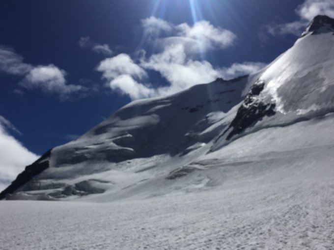 Aufstieg zum Morgenhorn nur ca. 15m hart. Ansonsten gute, grosse Tritte und perfekter Firn. Dies bedingt dass man rechts von der Flanke hochsteigt! Wer es gerne gefährlich und hart hat - kann, wie teilweise gespurt - 3-4 SL im blankeis hochsteigen :-(