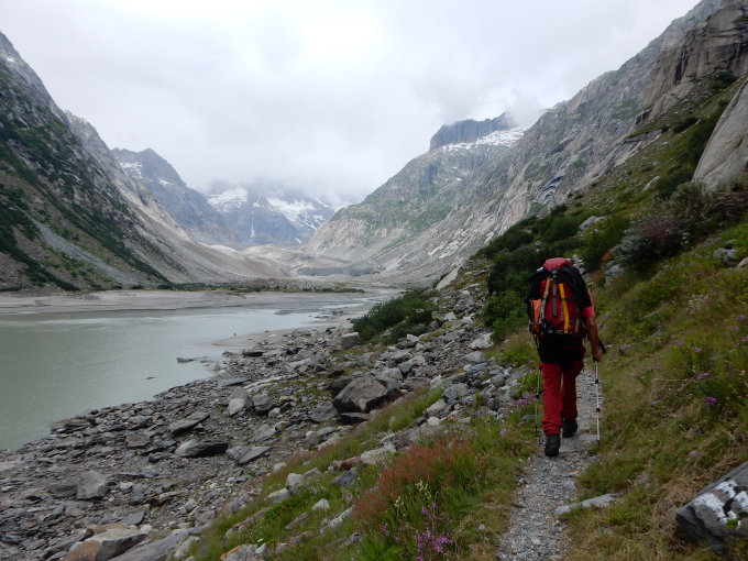 Aufstieg zum Aarbiwak bei wolkenverhangenem Himmel. Unbedingt Hinweis des Hüttenwarts auf der Homepage des Aarbiwaks betreffend Abgang vom Lauteraar-Hüttenweg in Richtung Aarbiwak beachten. Einsetzender Regen am Abend, der erst um 22 Uhr nachlässt.