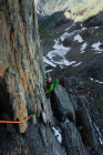 Die Schlüsselstelle ist eine steile Platte mit einem markanten, sich gegen oben öffnenden Riss mit verklemmten Steinen. Da im oberen Teil die verklemmten Steine fehlten und man daher nicht absichern konnte, erkletterten wir diese Stelle ca. 5m links davon entlang einer Schuppe. Das war zwar schwieriger, dafür absicherbar.