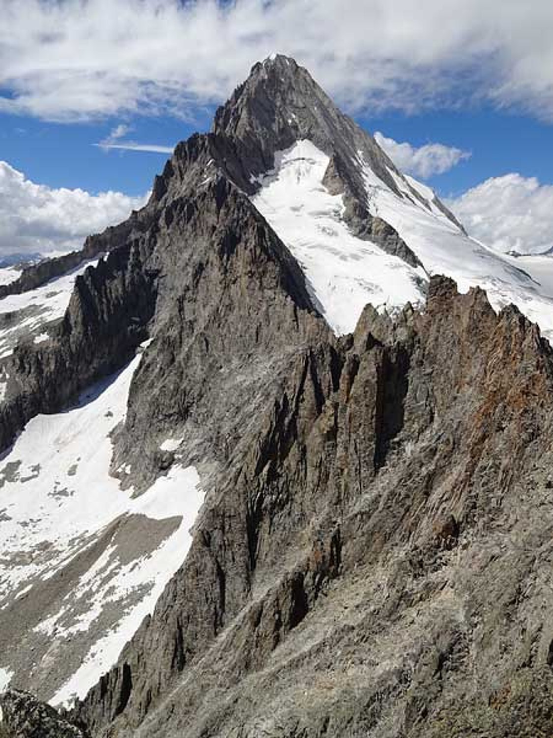 eigentlich wollten wir die rechte südwestrippe des westgipfels klettern, doch infolge unklarem einstieg erwischten wir eine teilweise wohl noch ungekletterte linie mit deutlich höheren schwierigkeiten (~6a+). im flachen mittelteil kann man dann problemlos von der einen zur anderen rippe wechseln, die linke erschien uns von hier aus gesehen lohnender. daher landeten wir schlussendlich auf dem verbindungsgrat stockhorn-bietschhorn (siehe routenbeschreibung oben).