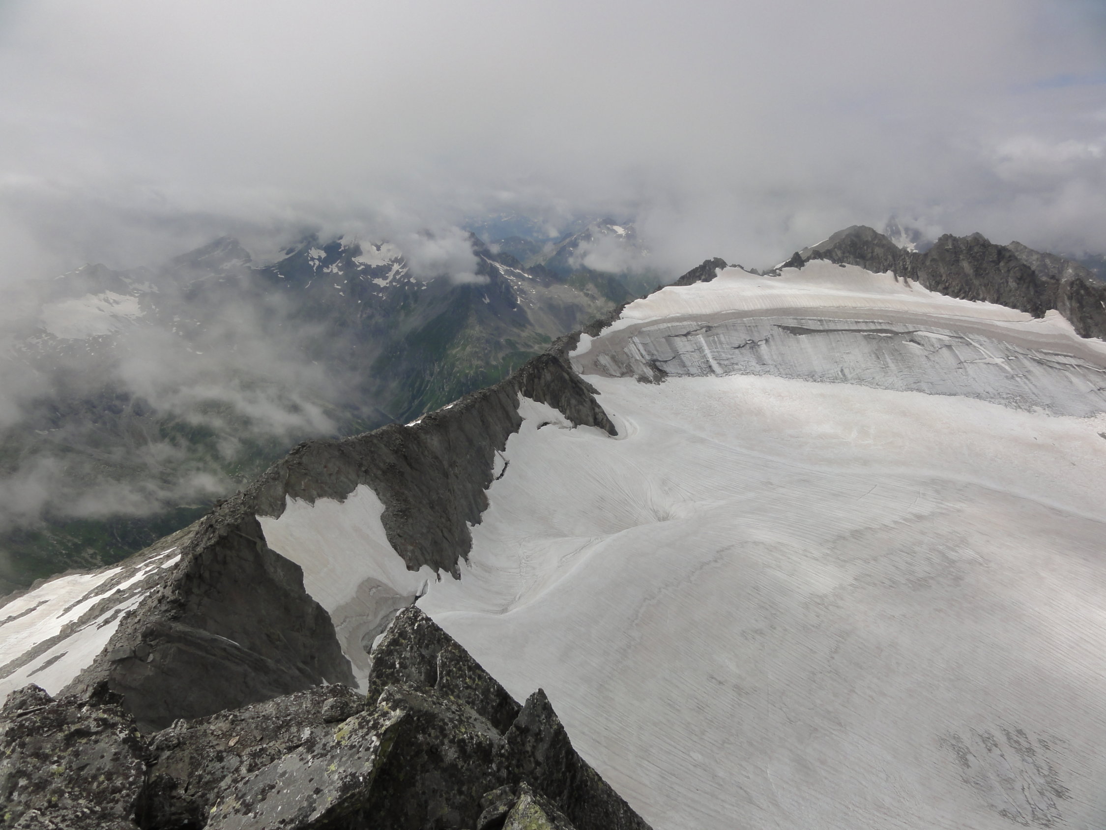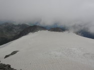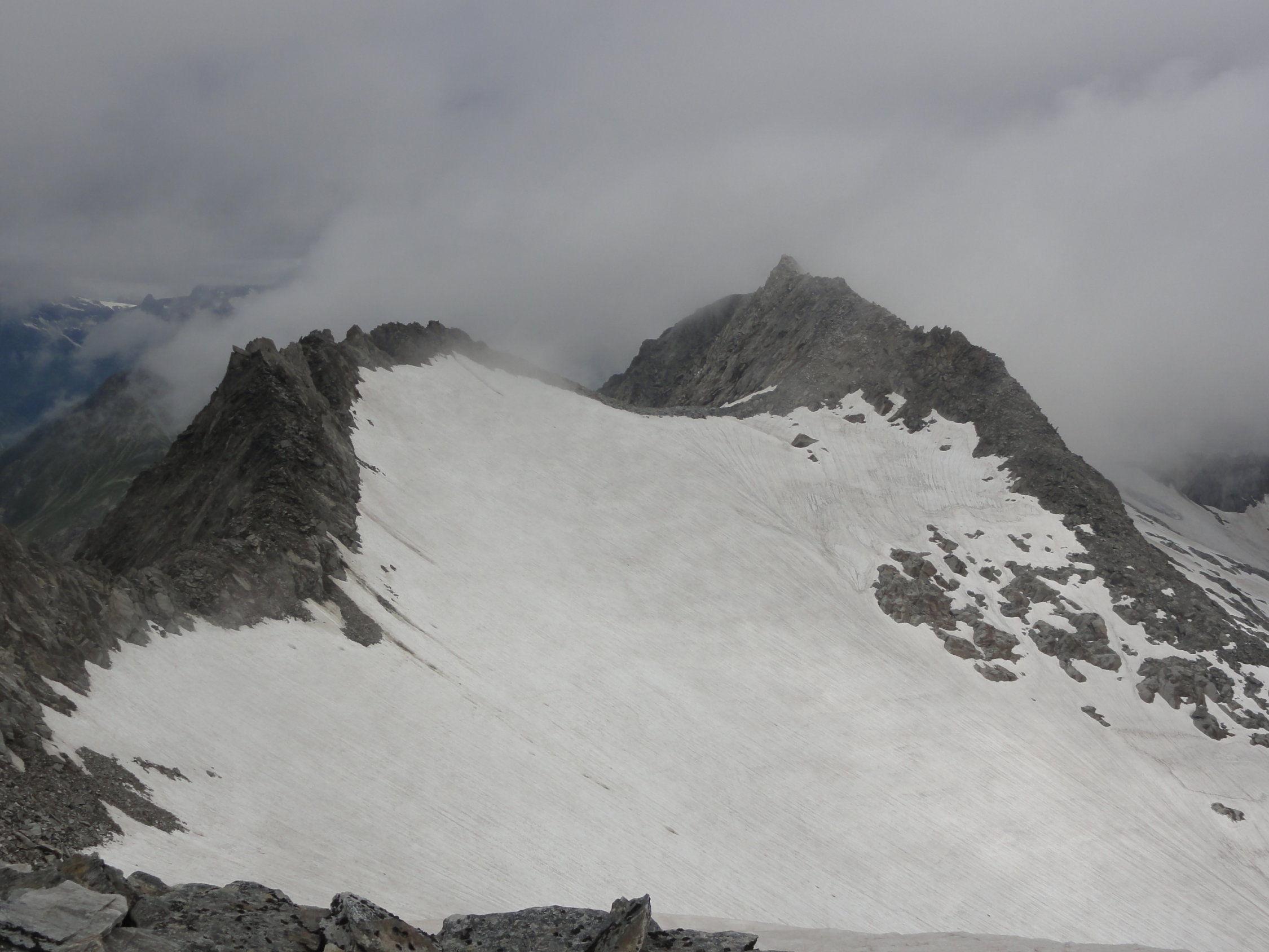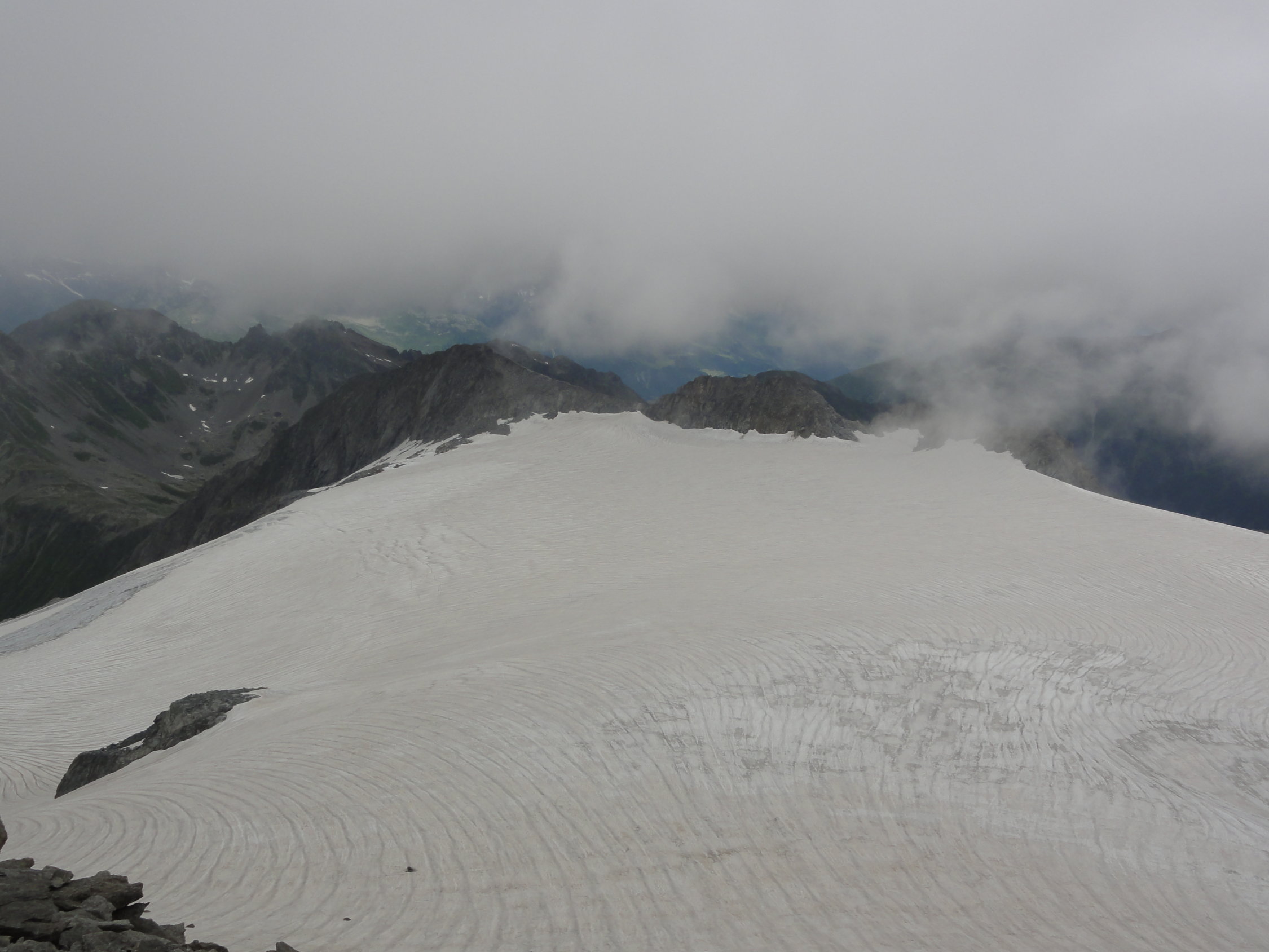 Abstieg Terrihütte: Greina-Gletscher mit Schneeauflage, nicht blank. Gletscher via Felsscharte zu erreichen, die im Nebel besser via Schneefeld südlich vom Piz Greina erreicht wird. Gelände unterhalb Gletscher: Nur an neuralgischen Punkten ein paar Steinmännchen. Abstieg aber logisch, da immer wieder Fels- oder steile Plattenbänder zu queren sind.
