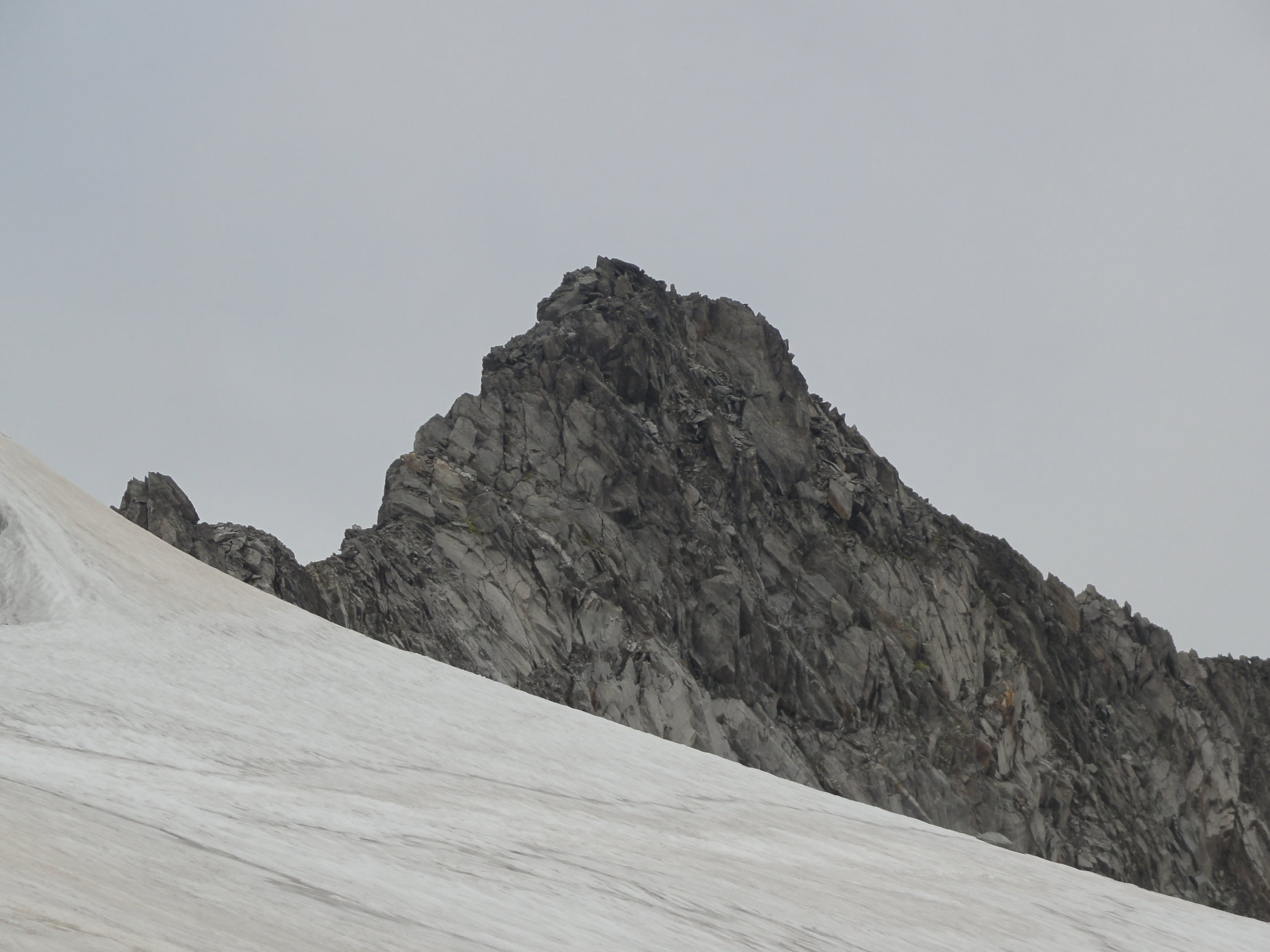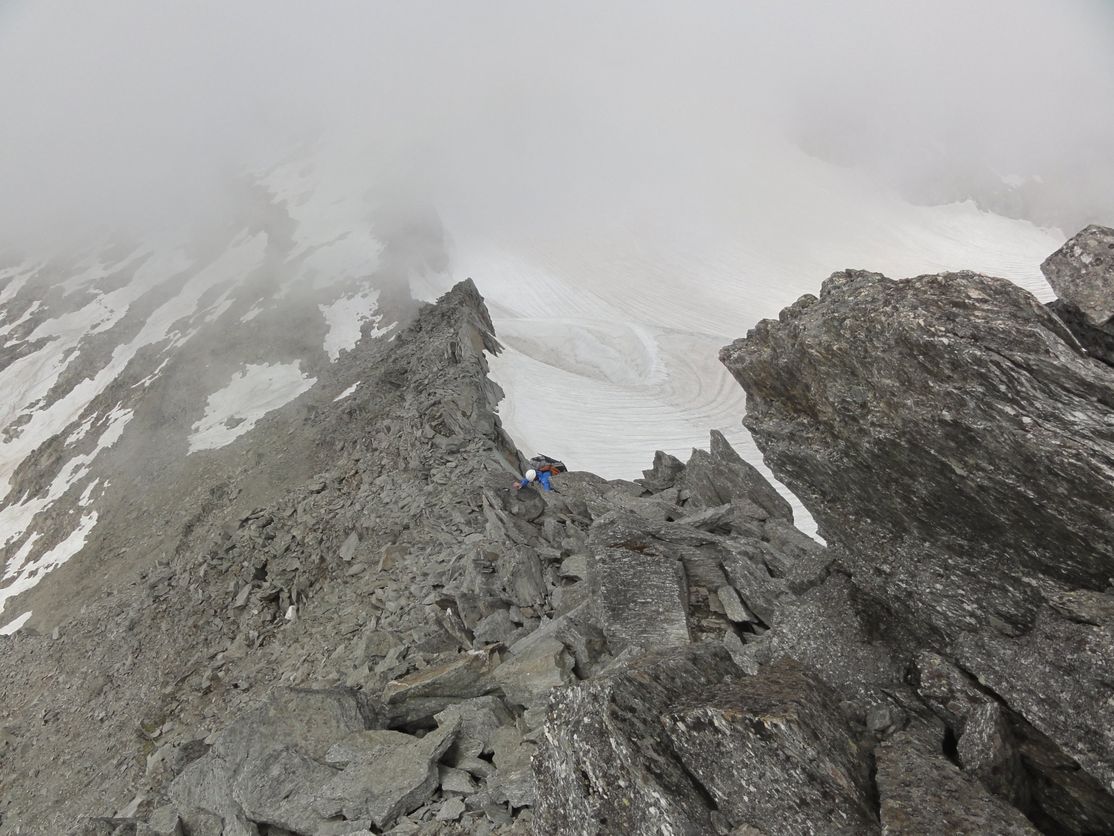 Piz Gaglianera: Nicht gemacht, da Rucksäcke zum eleganten Klettern zu gross. Eine schmale recht exponierte Passage zwischen Scharte und Vorgipfel. Gipfel würde sich über die bewegende Südseite ebenfalls besteigen lassen.