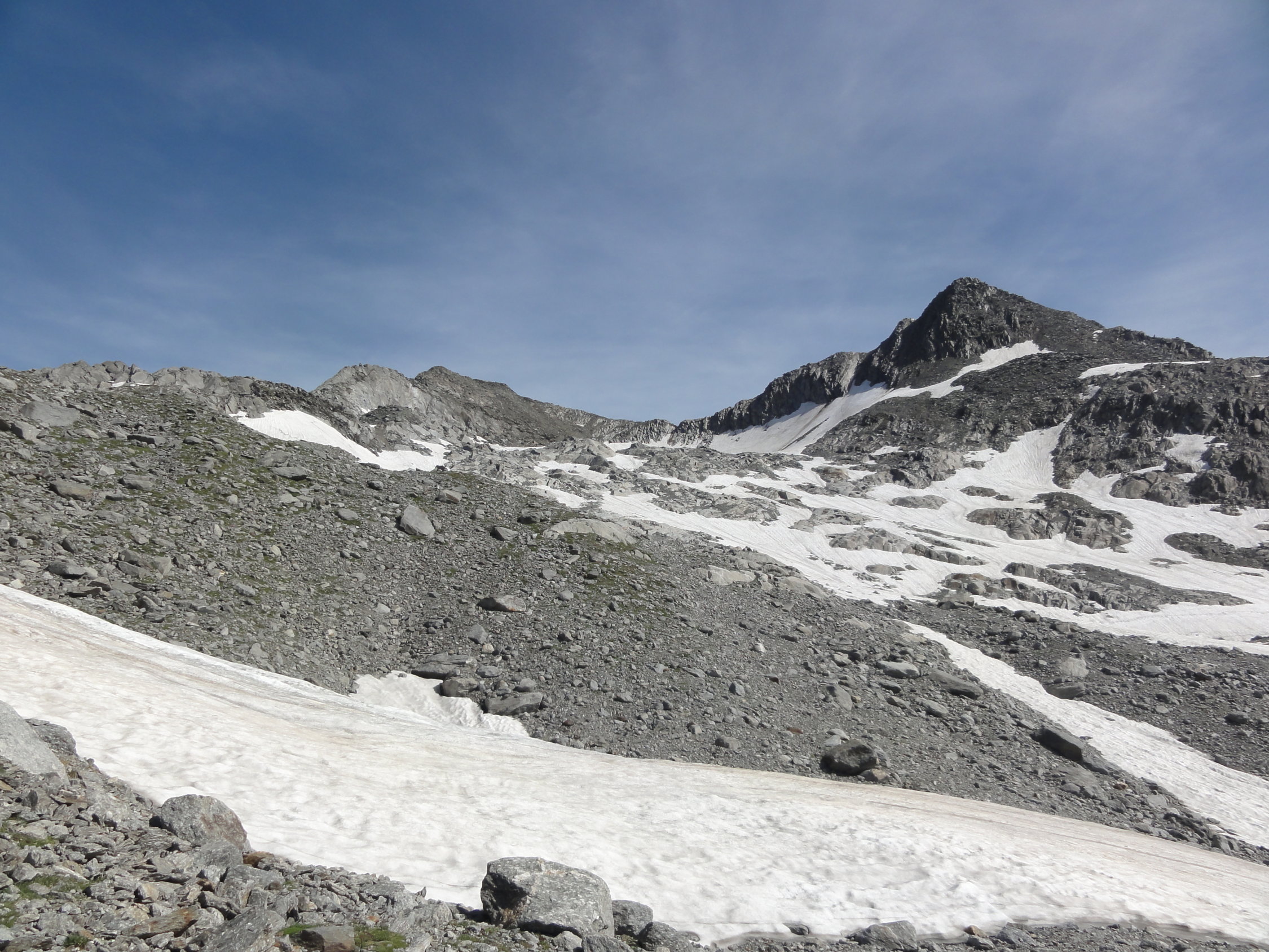 Piz Vial: Grat zwischen Gaglianera und Vial nicht gemacht. Gelände derzeit über stabile Firnfelder bis in den Schlusshang leicht zu begehen. Dann ist Aufpassen angesagt - Kühlschrankgrosse Felsbrocken, die in Bewegung kommen können.