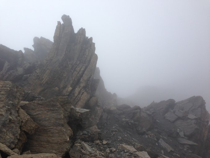 Neblig und noch nass war der Aufstieg aus dem Färmeltal. Trotzdem war es ein angenehmer kühler Aufstieg bis aufs Furggeli. Auf dem Furggeli blies ein kalter Wind und der Nebel zog über den Grat. Vom Furggeli aufs Albristhorn über den Hempliger wurde es etwas anspruchsvoller. Der Aufstieg führt durch eindrucksvolle Felsverformungen.