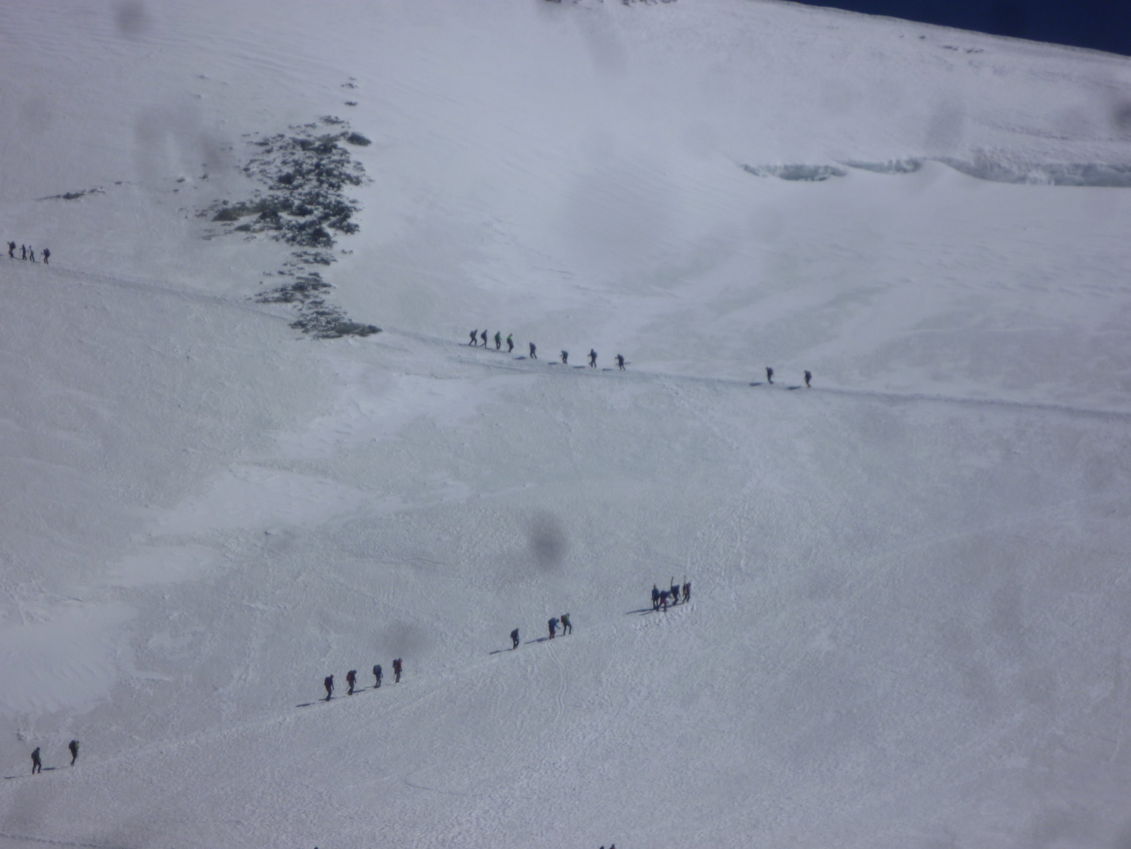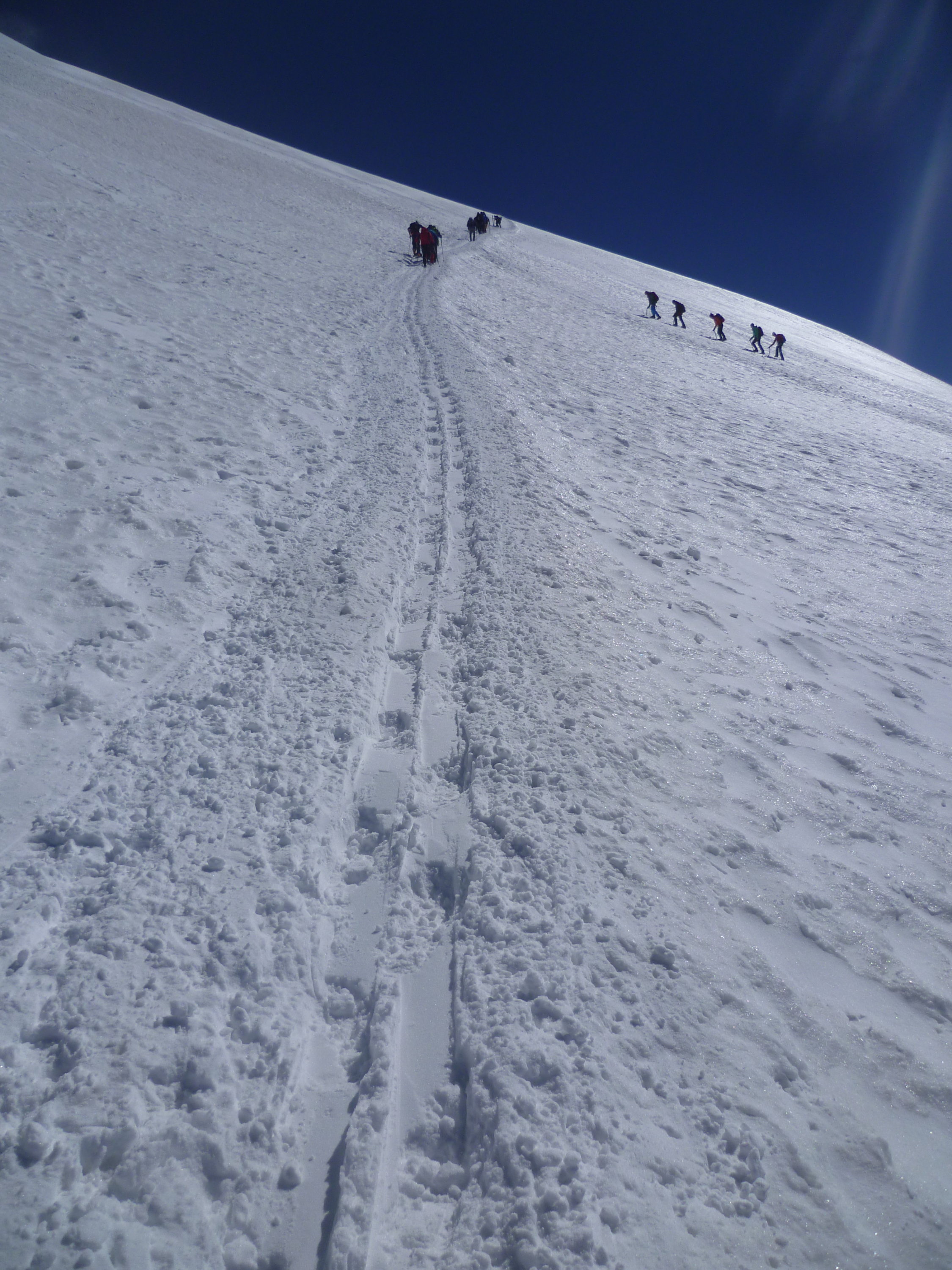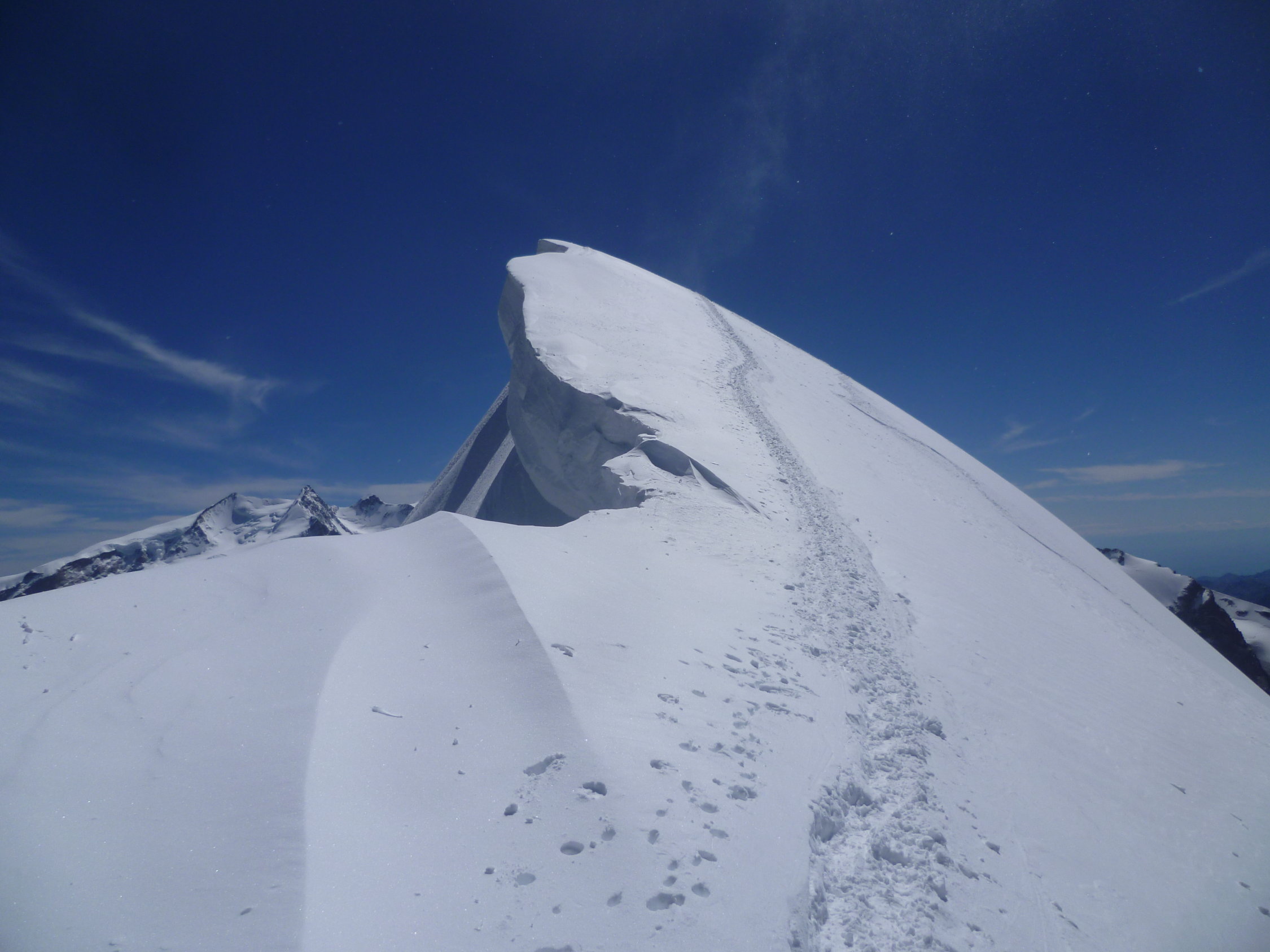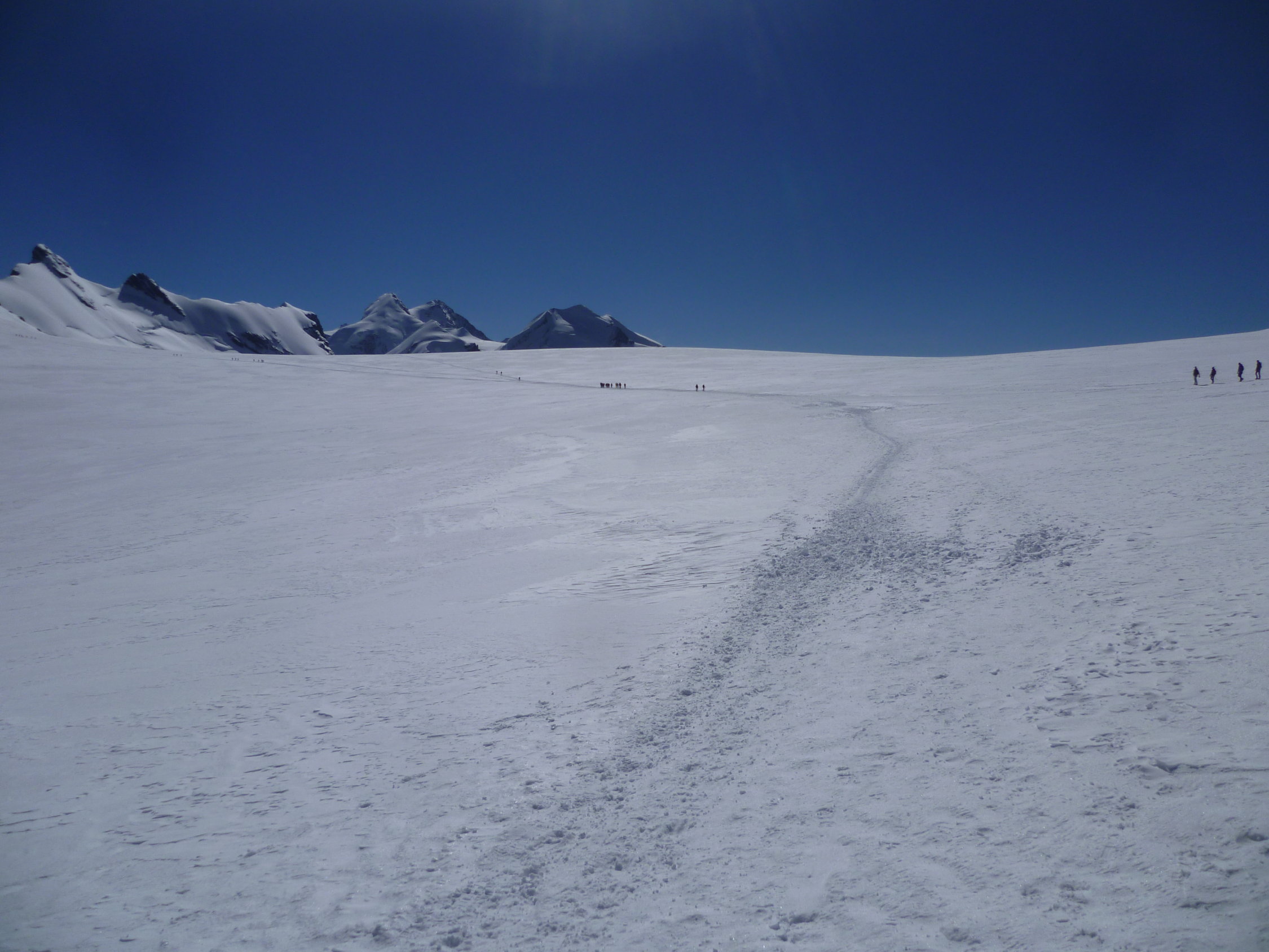 Gute Spur trotz frischem Pulverschnee. Starker und böhiger Wind. Einige waren am Breithorn Westgipfel auch mit Ski unterwegs.