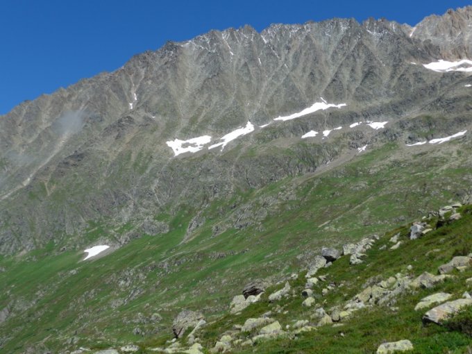Nach Schlechtwetterphase Gras im Zustieg am Morgen noch sehr nass und stellenweise unangenehm und im Gipfelbereich noch etwas Neuschnee. Mit einiger Vorsicht in der Umgehung nach der Scharte vor dem Südgipfel ging es ohne Steigeisen. Ansonsten gute Verhältnisse.