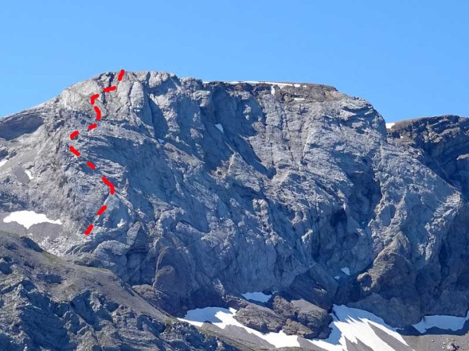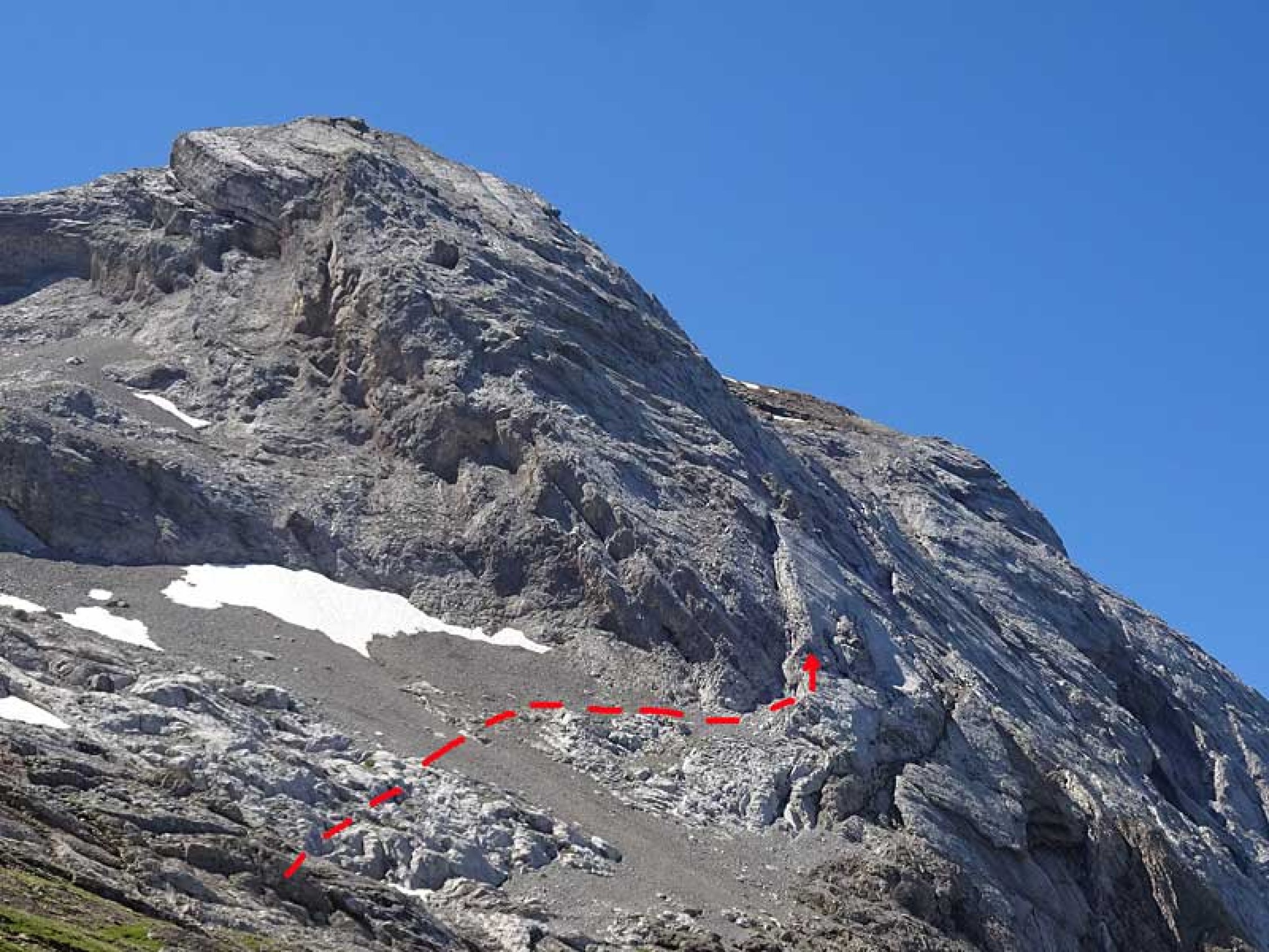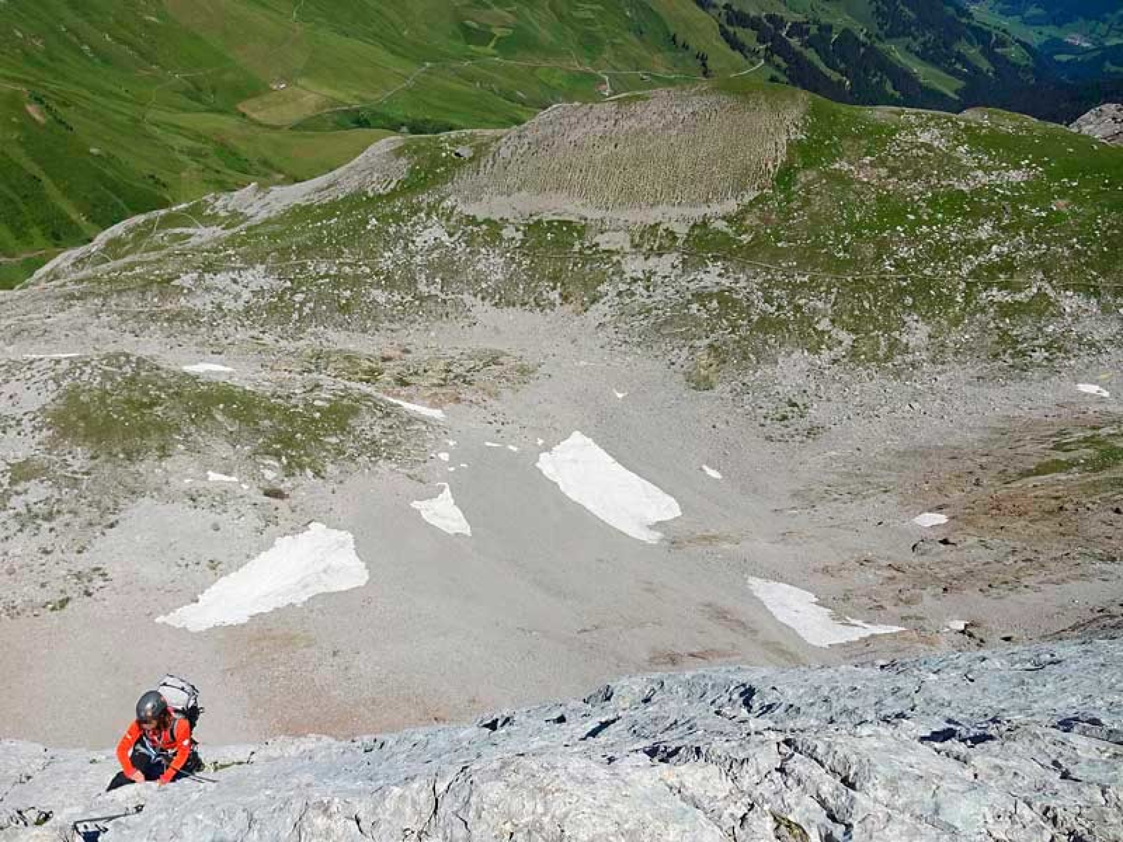 die im führer angegebenen kletterstellen im vierten grad konnten wir nicht finden. es handelt sich um eine tour im zweiten grad mit einigen dreier-stellen. über weite strecken nicht absicherbar, im mittelteil ziemlich brüchig.