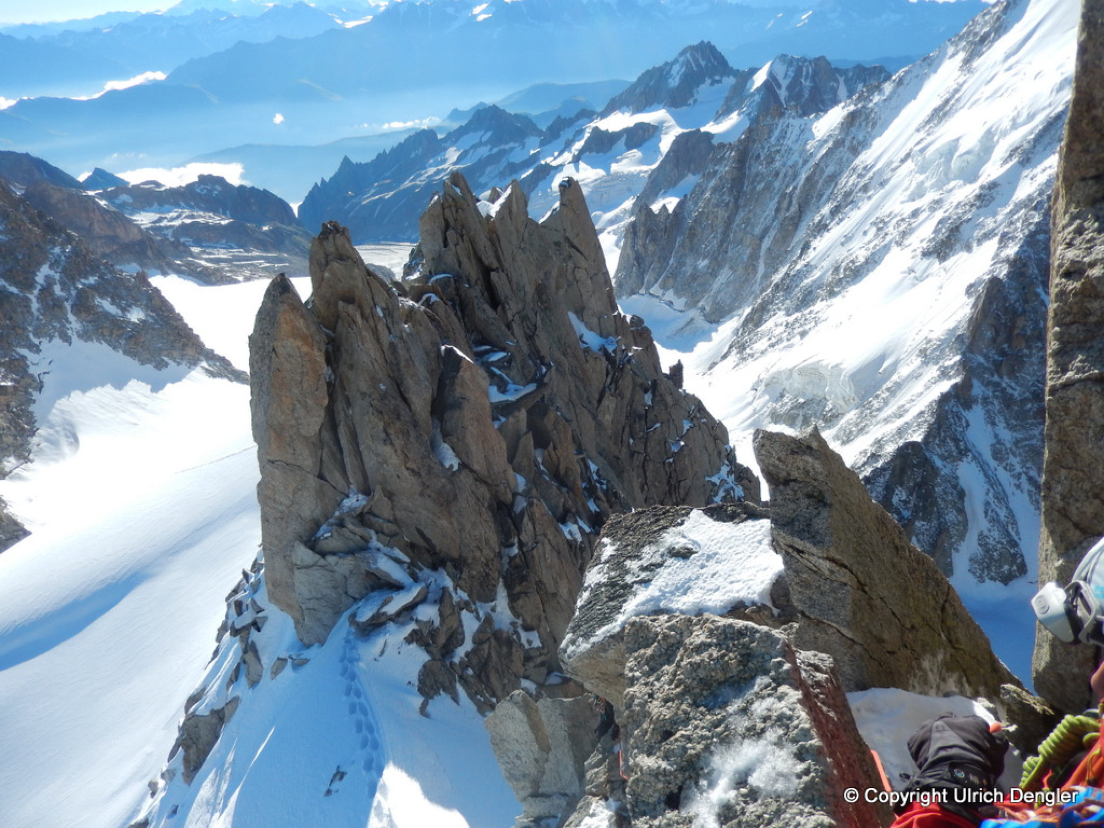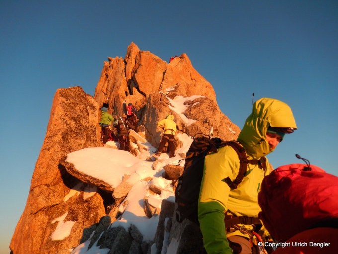 Den Grat erreicht man auf ca. 3700m. Er war durchgängig mit 20-40cm Neuschnee bedeckt. Die Spur führte in stetem Auf und Ab am Grat und in der rechten, nördlichen Flanke entlang. Der Grat besteht festem Granit und war trotz Schnee mit Steigeisen gut zu klettern. Gesichert haben wir mit Schlingen und kleinen Friends die leicht platziert werden können. Ein Sortiment bis Camalot 1 reicht aus.