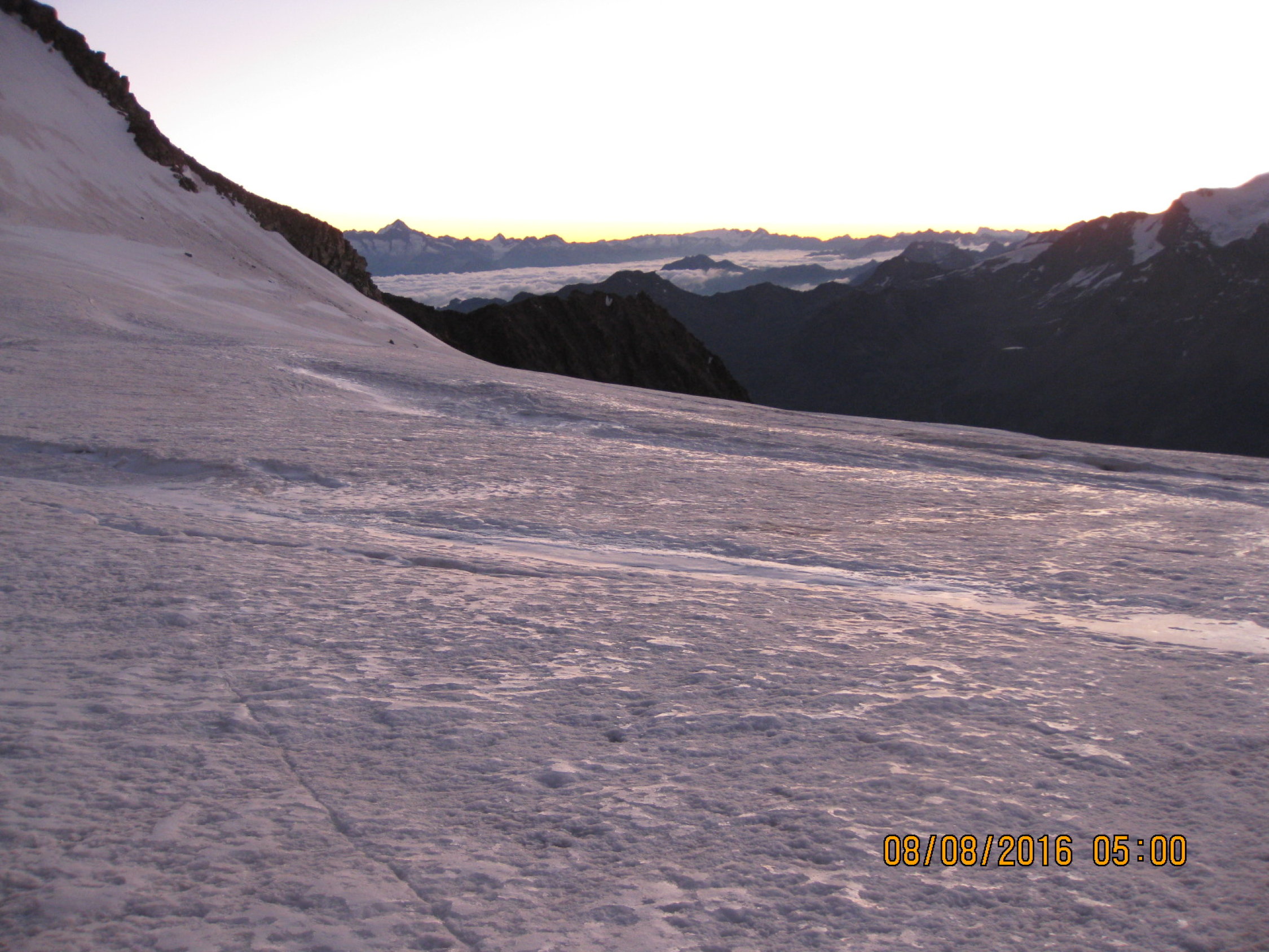 Sehr gute Verhältnisse auf der ganzen Route. Hie und da harmlose Risse im Hohbalmgletscher. Weiter oben an den Felsen kleinste Blankeisstellen.