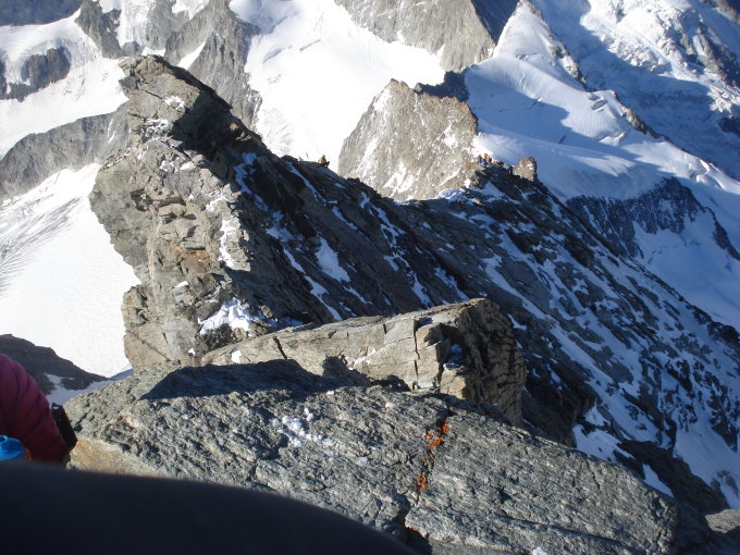 Gute, aber nicht perfekte Verhältnisse. Noch einiges an Schnee bzw. Eis (oberhalb der Biner-Platte), was etwas stört und Nachmittags sehr weich wird. Viele Seilschaften unterwegs, wodurch es bei manchen Stellen zu Staus kommt. Der Abstieg durch das Couloir von der Gabel hinunter geht mit Abseilen recht schnell.