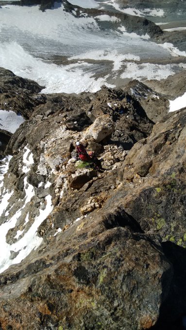 Der wenige Neuschnee von Freitag war wieder komplett weggeschmolzen. Konnten somit den gesamten Grat ohne Steigeisen klettern und haben diese erst am Gipfel für den Abstieg über den Nordgrat zum Mischabelbiwak angezogen.