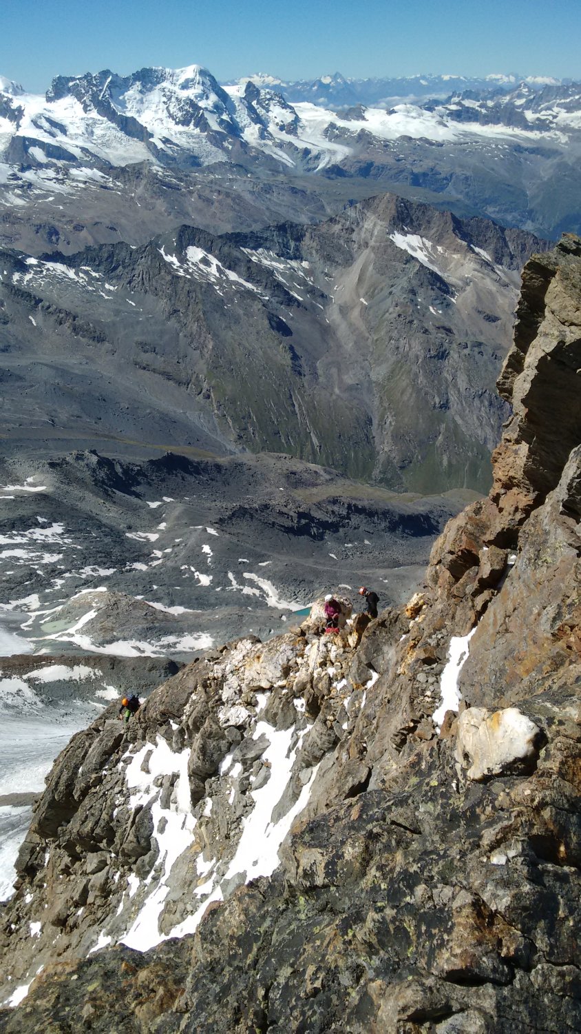Fels war erstaunlich fest für die Berge rund ums Mattertal. Lediglich die ersten paar Meter des Steilaufschwungs im oberen Teil waren etwas bröselig und wurden somit von den Seilschaften vor uns einige Steine losgetreten.