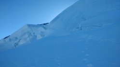 Abstieg über die Kinflanke im steilsten Teil (ca. 50°) zwischen 4100 und 4200 m vereist. Entweder über Eisschrauben sichern oder alternativ seilfrei gehen.