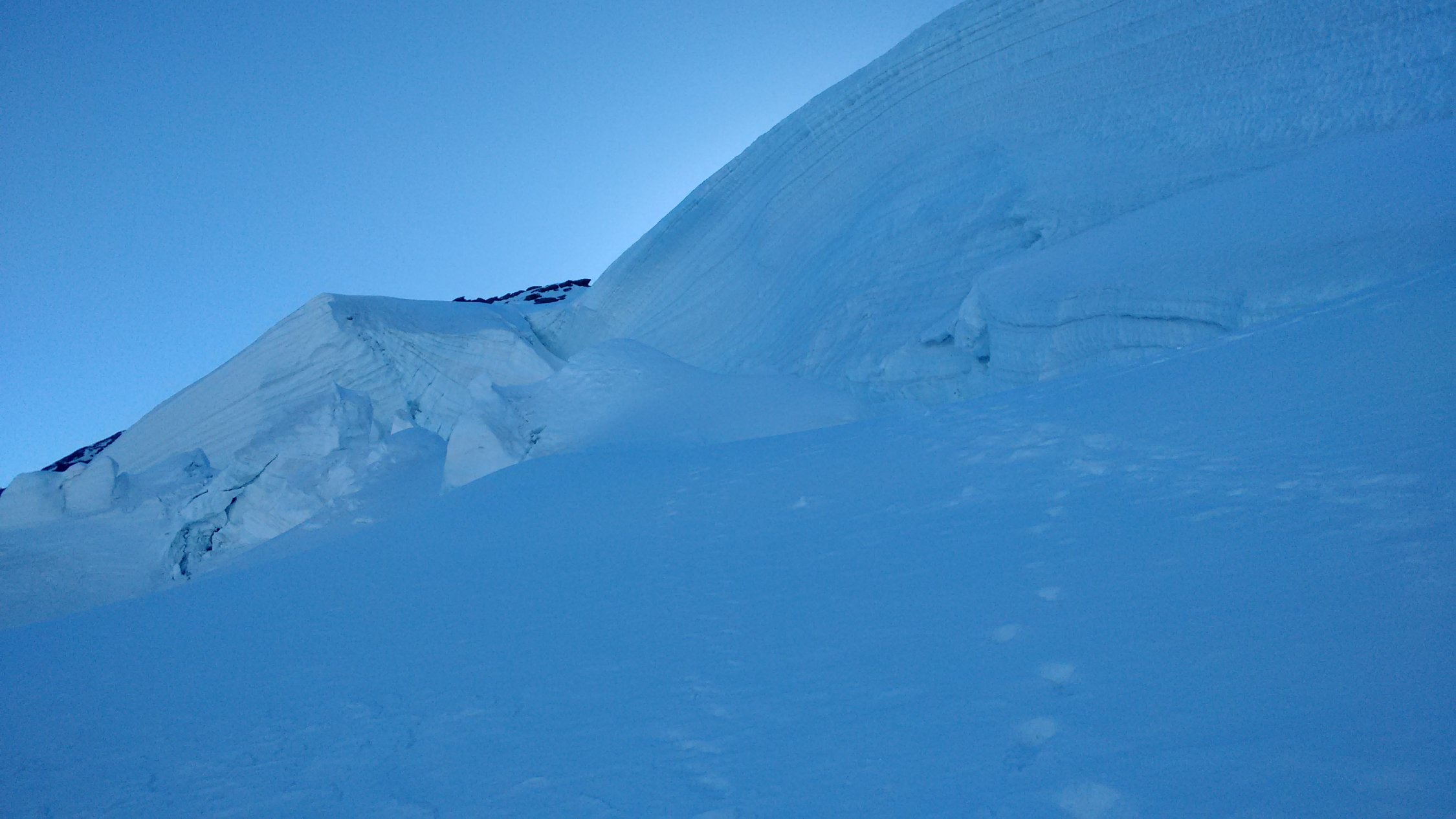 Die Wechten müssen teilweise in sehr steilen Firnteilen gequert werden, die Spur war allerdings hervorragend. Auch in der Schlüsselstelle kurz vor dem Steilaufschwung am Ende des Firngrates Spur nicht vereist.
