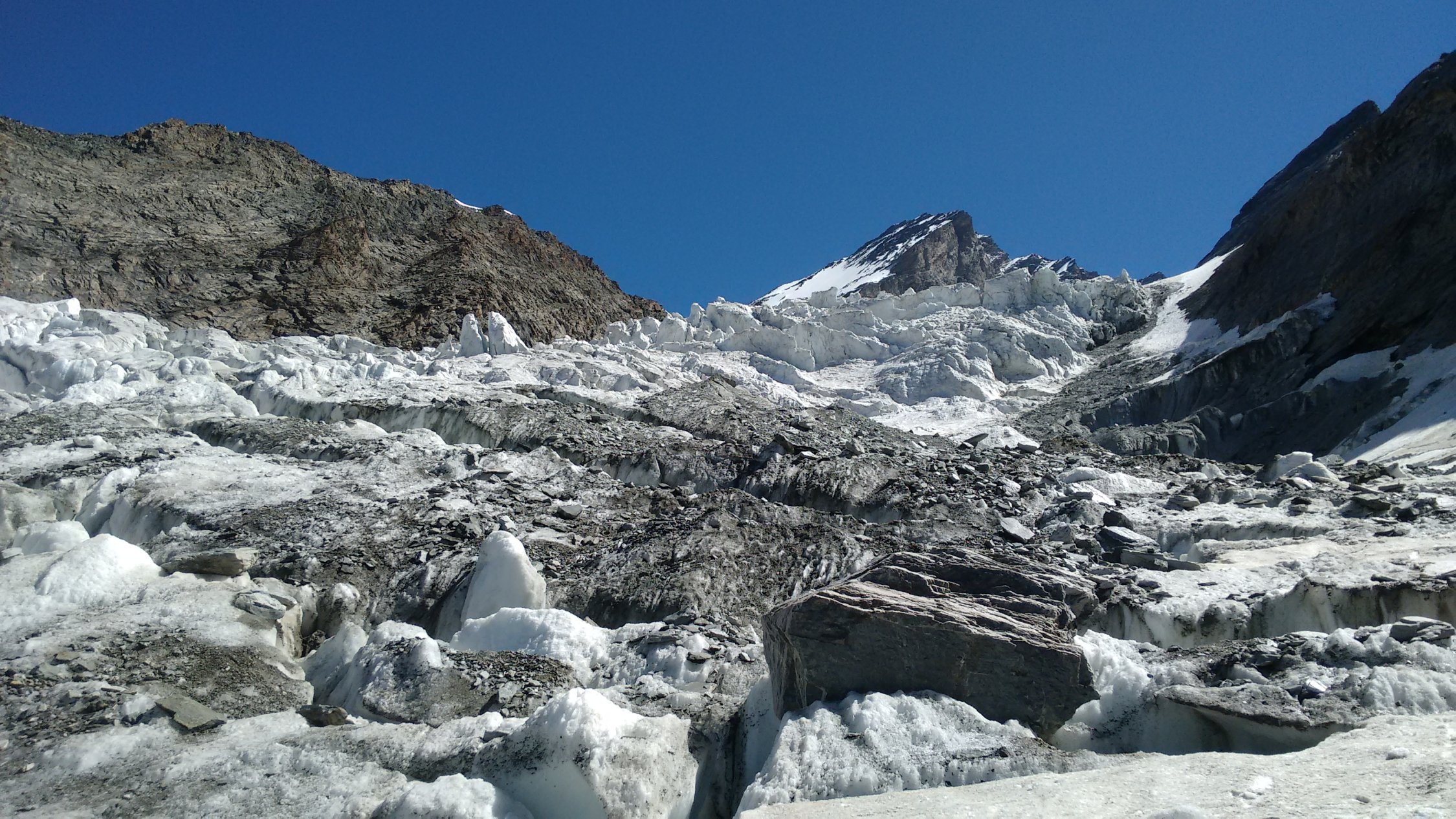 Der Kingletscher ist starkt zerschrundet. Auf 3600m muss zur Nordflanke des Gletschers gequert werden und dort bis auf eine Höhe von 3350m teilweise im Geröll gelaufen werden. Unbedingt auf 3350m über den starkt verschrundeten Kingletscher wieder nach Süden traversieren, sonst folgt eine langwierige Abseilaktion durch den Gletscher (wie unsere 3 Schweizer Freunde erfahren mussten).