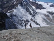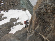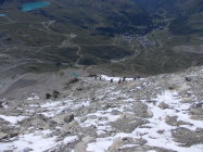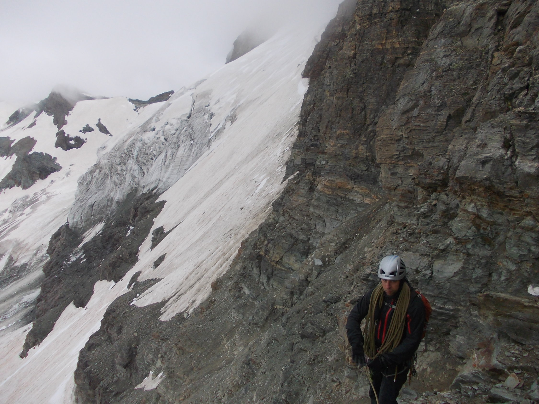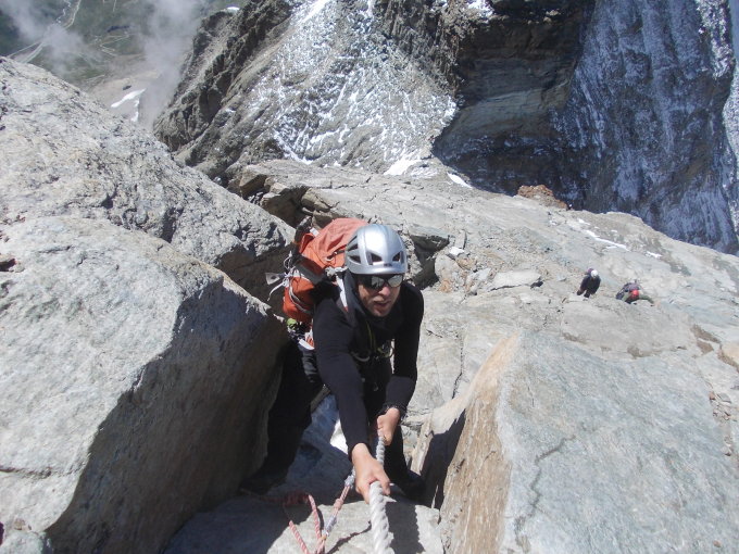 Entsprechend waren auch Hektik und Gedränge während des Aufstiegs. Aufgrund des Schnees und der Vereisungen musste die komplette Route ab Rifugio bis Gipfel mit Steigeisen geklettert werden, ebenso den Hörnligrat hinunter bis mindestens Solvay. Permanent starker Wind, der einerseits eine zermürbende Wirkung hatte, andererseits durchaus auch mal das Potential gehabt hätte, einem in entsprechender Ausgesetztheit auf einem Gratstück mit einer Böe aus dem Gleichgewicht zu bringen.