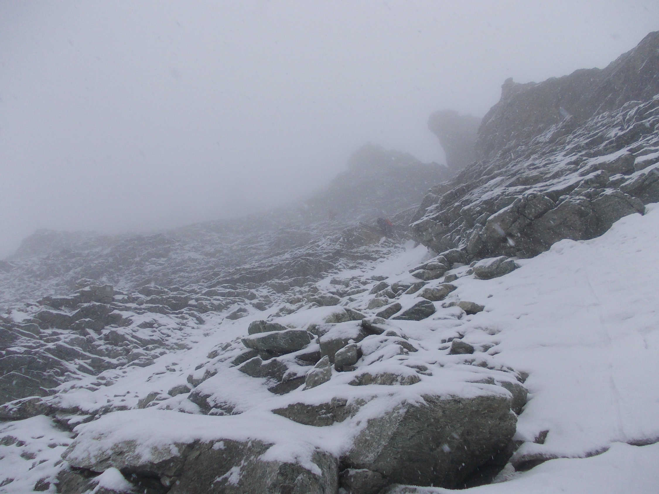Am Folgetag, Dienstag, bereits in der Früh dichte Bewölkung, sprich Nebel und Schneefall. Haariger Abstieg auf dem unter den gegebenen Umständen menschenleeren Hörnligrat.