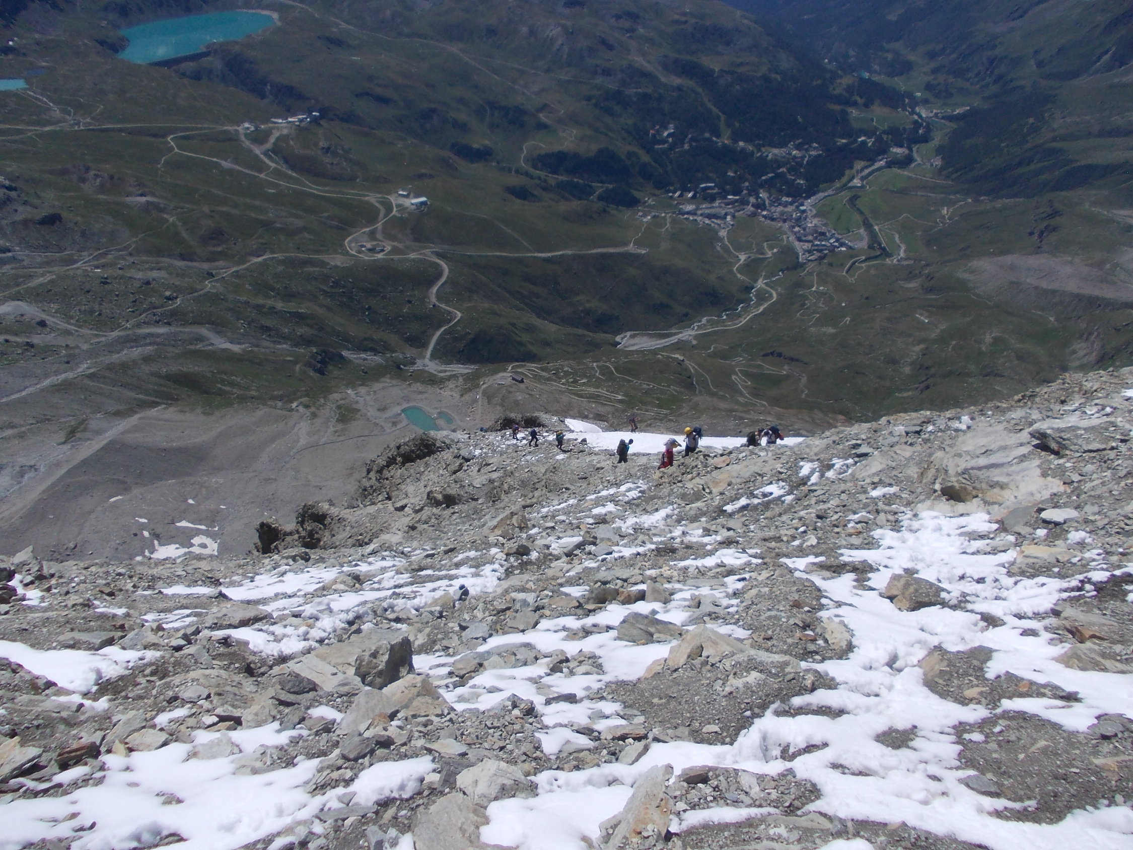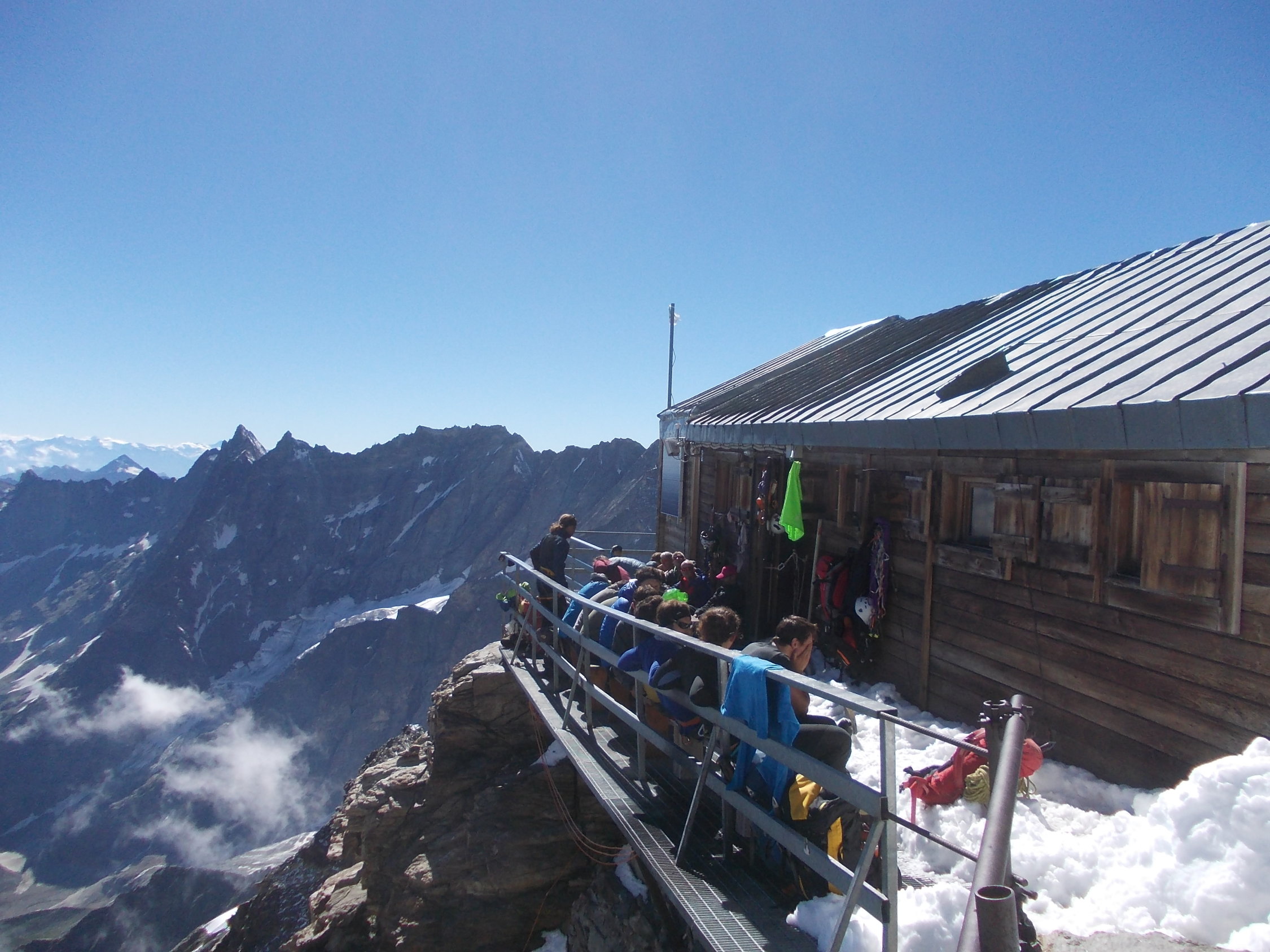 Sonntag Aufstieg zum Rifugio Carrel. Das für 40 Personen vorgesehene Rifugio platzte aus allen Nähten, schätzungsweise 70 Personen drängten sich in den Betten, oder lagen auf dem Boden. Es war heiß und stickig, eine permanente Geräuschkulisse von hinaus- und hineingehenden, bzw. aufbrechenden oder vom Grat zurückkehrenden Gipfelaspiranten ermöglichte praktisch keinen Schlaf.