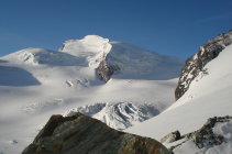 Mit der ersten Metro hoch bis Stollenausgang, es folgte eine kurze Abfahrt zum Allalingletscher, auf guter Spur hoch zum Adlerpass, links queren zum Gifel des Strahlhorns.