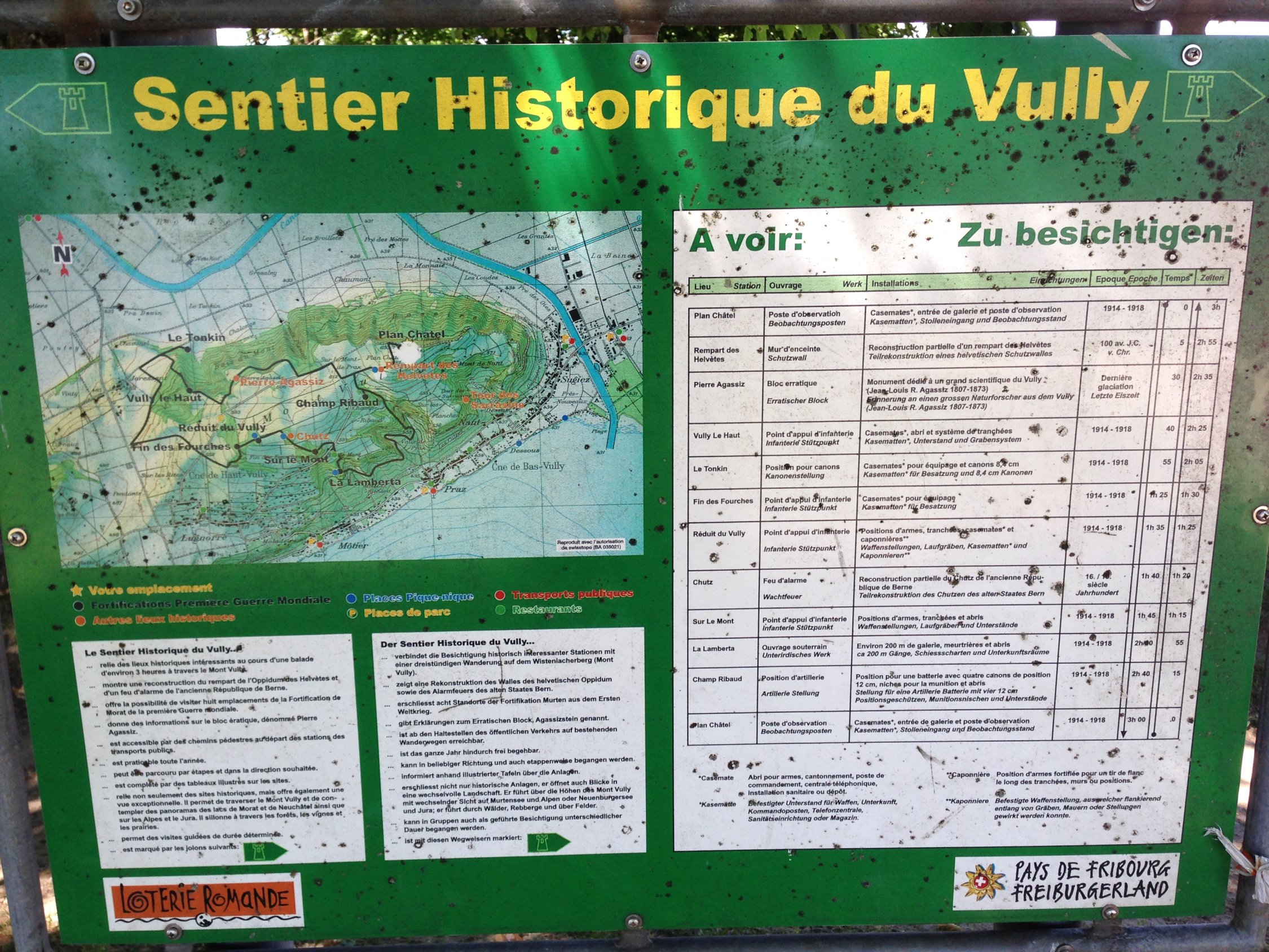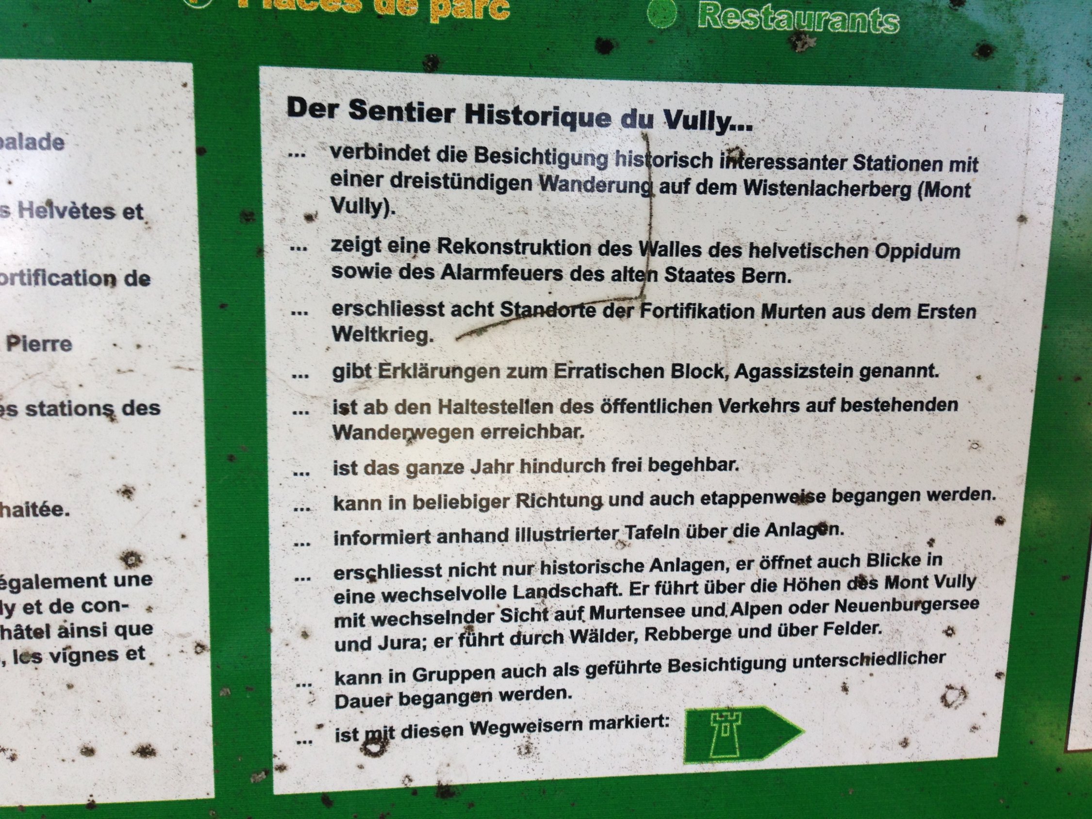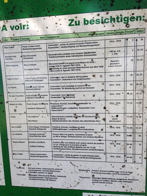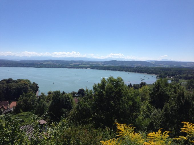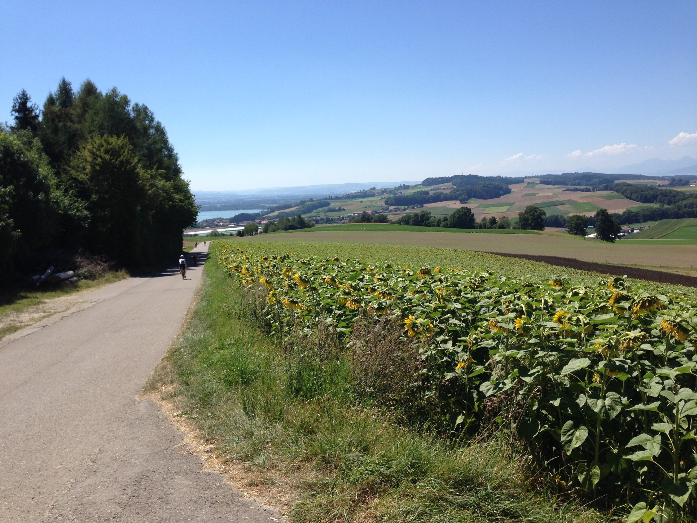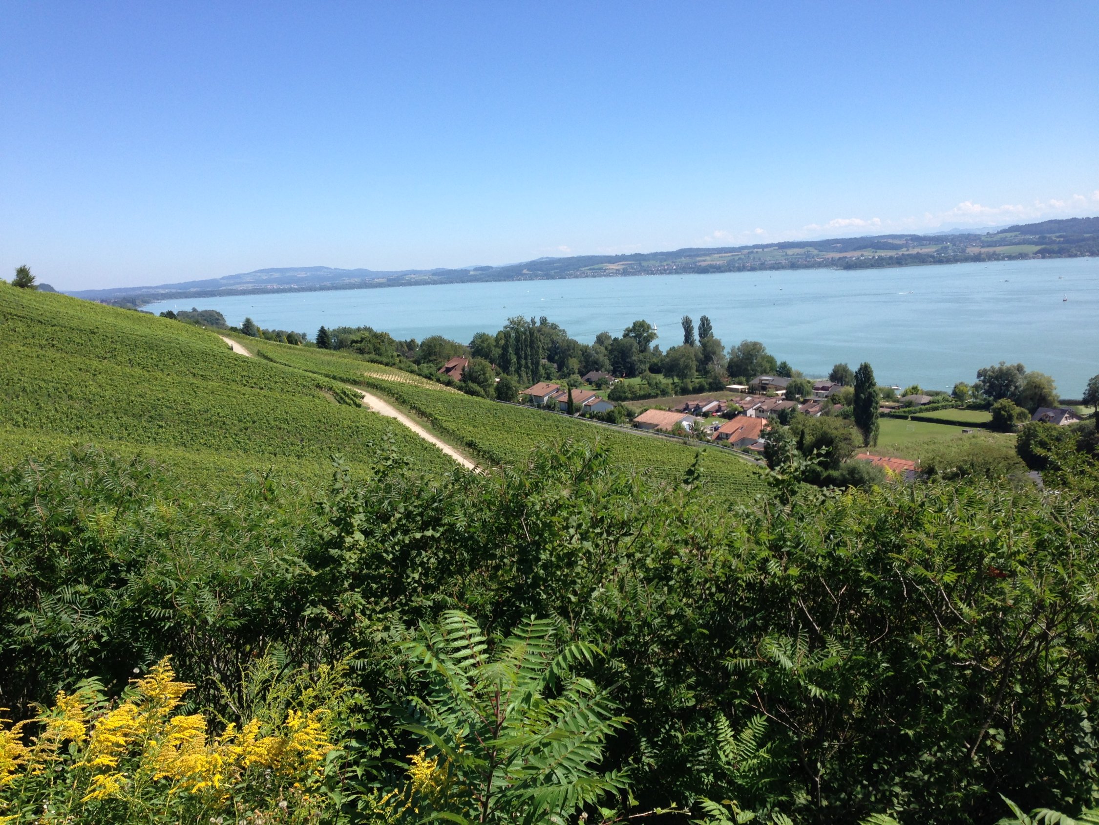 Schönes heisses Wetter. Fahrt durch die schattigen Wälder und dem kühlen Fahrtwind war angenehm. Bei Salavaux bietet sich die Gelegenheit an einem Sandstrand baden zu gehen. Der Aufstieg über die Rebberge auf den Mont Vully stellt ein Höhepunkt dar. Die Abfahrt nach Sugiez führt durch einen kühlen Wald. Neben dem bekannten Wein gibt es für Historiker auf dem Mont Vully noch eine dreistündige Wanderung entlang der Festungen aus dem Mittelalter und dem ersten Weltkrieg.