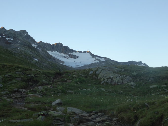 Der erste Steilhang (Grasfläche) zwischen den geschliffenen Felsen hat einige lose Steine drin. Der unangenehmste Abschnitt der Tour. Weiter oben ist das Gletschervorgelände kompakt.