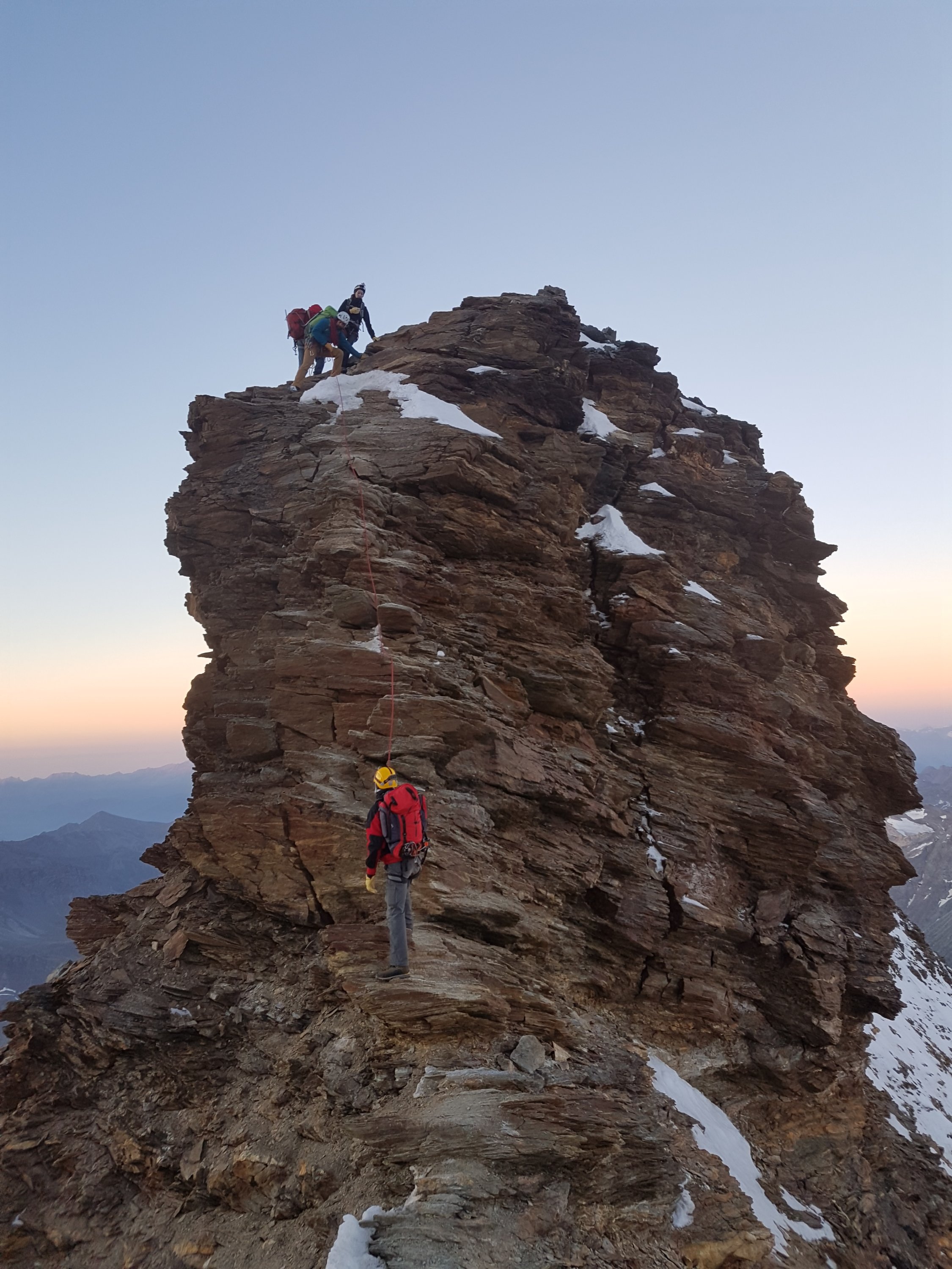 Wie zu erwarten war es sehr voll und dementsprechend "gemütlich" auf der Carrelhütte. Wir waren gegen 5 Uhr erst relativ spät oben, da wir am selben Tag angereist waren und haben nur mit Glück noch eine Matratze zum Teilen ergattert. Viel schlafen kann man dort nicht wirklich, es ist ein ständiges Kommen und Gehen (die letzten Seilschaften sind gegen 9 vom Gipfel gekommen, die erste gegen halb eins wieder aufgebrochen). Wir sind um kurz vor 4 gestartet und waren gegen halb 9 auf dem Gipfel. Für den Abstieg haben wir wesentlich länger gebraucht (6.5h). Generell ist auf der italienischen Seite viel mehr fixes Material als auf der Schweizer Seite. Material: 30m Seil (haben nur ein Mal eine halbe SL über die untere Mosleyplatte abgeseilt), ein paar Friends, Schlingen / Expressen. Insgesamt eine sehr schöne Tour, auch wenn sie natürlich hoffnungslos überlaufen ist. Dies ist vor allem in der Hütte / beim Start lästig, später verteilt es sich ganz gut. Die Felsqualität war besser als erwartet!