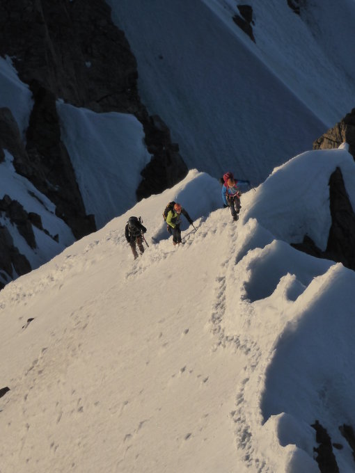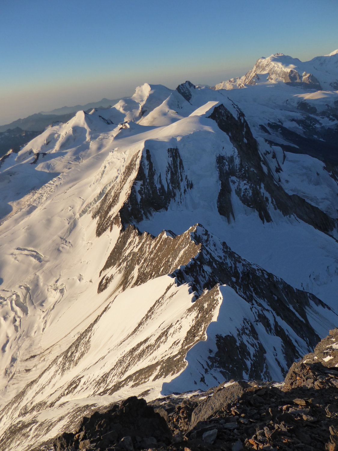 Sehr gute Verhältnisse am Grat. Täschhorn Mischabelgrat bis auf das Firnstück Schneefrei. Abstieg bis Domjoch einige Wächten aber über die Schuppen etwas unangenehm aber gut zu gehen. Ab Joch Schneefrei und ohne Steigeisen auf den Dom.