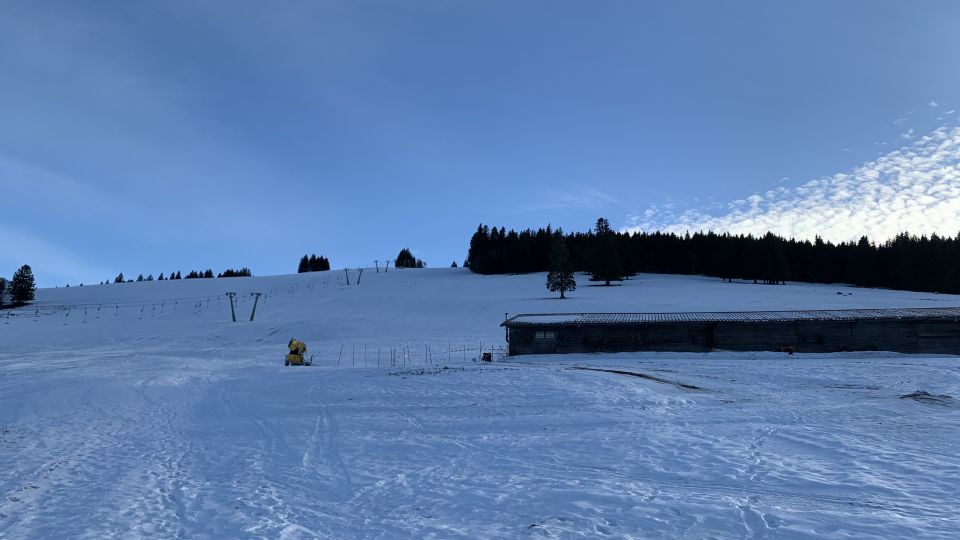 Wenig, doch gesetzter Schnee, leicht mit ein paar Zentimeter gezuckert, keine Tragestrecken.